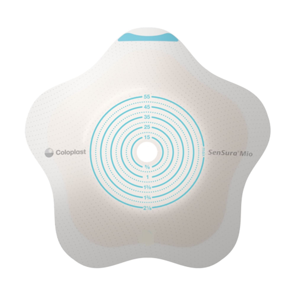 SenSura® Mio Base adesiva Côncava em forma de estrela,que fornece contato corporal seguro e um encaixe flexível durante o movimento. A composição especial do adesivo garante rápida adesão à pele e o formato aumenta a área de contato com a superfície abaulada, criando um encaixe seguro sem vincos e dobras e minimizando o risco de vazamento e problemas de pele.
