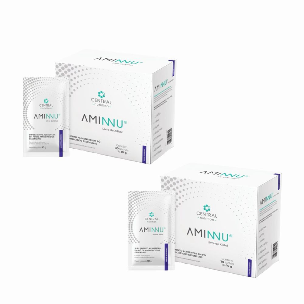 AMINNU SEM XILITOL. SABOR Blueberry. Caixa com 30 sachês de 10g cada. - Kit contendo 2 caixas com 30 sachês cada. Aqui na Educommerce você encontra os melhores produtos da Central Nutrition: Aminnu Blueberry disponibiliza os 8 aminoácidos essenciais em sua forma livre, prontos para serem absorvidos e utilizados pelo organismo. Por ser administrado em sua forma livre, esse suplemento alimentar garante 99% de eficiência na absorção, sendo uma ótima estratégia para aumentar a ingestão diária de aminoácidos essenciais e, assim, melhorar a capacidade de sintetização de novas proteínas. E o mais legal é que essa fórmula não possui adição de xilitol!!ATENÇÃO: O Aminnu deve ser utilizado com cuidado e preferencialmente após uma consulta com médico especialista - especialmente se você possui alguma condição de saúde, está sob medicação, está grávida ou amamentando. ATENÇÃO2: Esse produto não é um medicamente, mas sim um suplemento alimentar isento de Registro no MS/ANVISA de acordo com o artigo 3 da RDC nº 21/2014. Não é recomendável exceder a recomendação diária do fabricante do produto. Sempre consumir com supervisão médica. Manter fora do alcance de crianças.