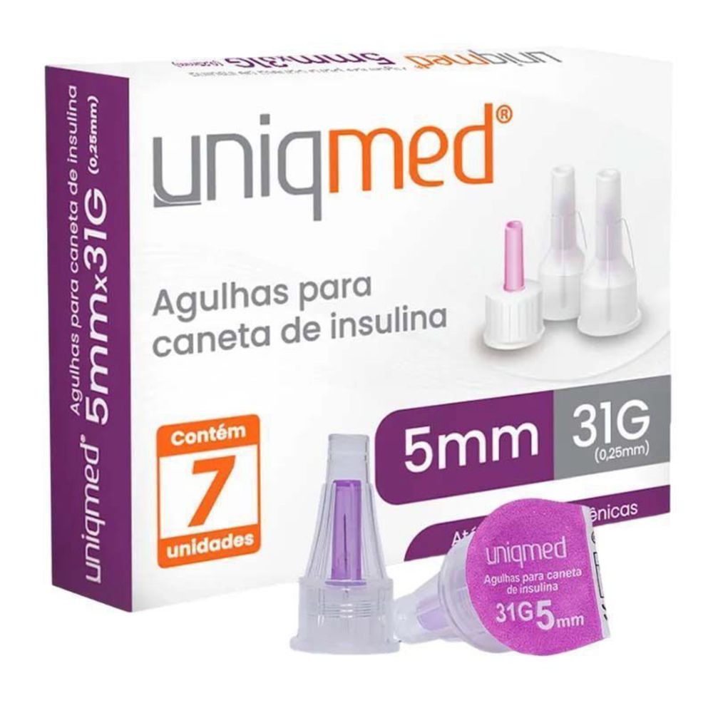 Agulha Uniqmed Universal Curta 31G 5mm c/ 7 Agulhas para Caneta de Insulina - Agulha descartável para caneta de insulina confeccionada em aço inoxidável, siliconizada, bisel trifacetado, compatibilidade com todos os sistemas de aplicação de insulina (canetas).Agulha Universal para caneta de Insulina - COMPATÍVEL COM TODAS AS CANETAS DISPONÍVEIS NO MERCADO- Comprimento: 5mm;- Calibre: 31G;- Curta;- Agulha siliconizada, facilita a punção e proporciona o máximo de conforto.- Compatível com todas as canetas disponíveis no mercado inclusive:Human Pen Ergo, Innovo, Novo Pen 3, Opti Pen Pro, Lantus, Novo Pen, Apidra, Humulin, Humalog, entre outras.- Agulhas siliconizada de aço inoxidável;- Bisel trifacetado;- Cone externo do conjunto com rosca;- Protetor interno e externo de agulha;- Lacre na base do cone;- Adaptação e fixação segura na caneta;- Maior capacidade de penetração, suave e contínuo;- Maior segurança ao conjunto;- Proteção e garantia de esterilização;- Uso com pinçamento, previne aplicação intradérmica.