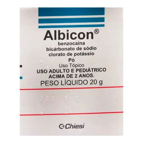 Albicon em pó 20g é uma associação de bicarbonato de sódio, benzocaína e clorato de potássio, para o tratamento da afta, gengivite, estomatite, candidíase oral e profilaxia do tártaro dentário. Uso tópico. Indicado para uso adulto e pediátrico a partir dos 2 anos.