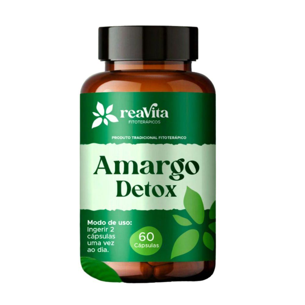 Amargo Detox Reavita auxilia na digestão, elimina toxinas e promove leveza natural. Amargo Detox Reavita é um suplemento alimentar em cápsulas formulado com Cargueja Amarga, Espinheira Santa, Sene e Alcachofra, ervas tradicionalmente reconhecidas por favorecerem o bem-estar digestivo e a desintoxicação natural do organismo.Principais benefíciosAuxilia na digestão e no equilíbrio intestinalFavorece a eliminação de toxinas e líquidos retidosPromove conforto abdominal e sensação de levezaContribui para o bom funcionamento do fígadoIdeal para uso diário na rotina de autocuidadoFavorece a digestão e o bem-estar intestinalResultados esperadosCom o uso contínuo, auxilia na melhora da digestão, redução do inchaço e eliminação de toxinas, proporcionando leveza e bem-estar geral.Principais ativosCargueja Amarga: ação digestiva e depurativa.Espinheira Santa: contribui para o equilíbrio estomacal.Sene: estimula o bom funcionamento intestinal.Alcachofra: favorece a digestão e o metabolismo hepático.Indicado paraPessoas que buscam um suporte natural para digestão, equilíbrio intestinal e desintoxicação corporal de forma prática e segura.Modo de usoIngerir 2 cápsulas ao dia, preferencialmente antes das principais refeições, ou conforme recomendação profissional.Principais diferenciaisFórmula natural com ervas tradicionaisLivre de glútenCápsulas de gelatina e glicerina (fácil de engolir)Produto prático para o dia a diaQualidade ReavitaComposição e quantidadeIngredientes: Cargueja Amarga, Espinheira Santa, Sene e Alcachofra.Cápsula: Gelatina, umectante glicerina.Apresentação: Frasco com 60 cápsulas.Sugestão de uso: 2 cápsulas ao dia.Informações legaisProduto dispensado de registro conforme RDC nº 27/2010.Este produto não substitui uma alimentação equilibrada.Não contém glúten.Principais perguntas1. O que é o Amargo Detox Reavita?É um suplemento natural com ervas que auxiliam na digestão e eliminação de toxinas. 2. Quantas cápsulas devo tomar por dia?A dose recomendada é de 2 cápsulas ao dia. 3. Contém glúten?Não. O produto é totalmente livre de glúten. 4. Posso usar diariamente?Sim, o uso diário é indicado para manutenção do equilíbrio digestivo. 5. Possui efeitos colaterais?O produto é natural e seguro, mas recomenda-se seguir a dosagem recomendada. 6. Ajuda na redução do inchaço?Sim, por auxiliar na digestão e eliminação de toxinas. 7. Tem sabor amargo?Não, por estar em cápsulas, o sabor das ervas não é sentido. 8. Pode ser usado por qualquer pessoa?Indicado para adultos. Em caso de dúvida, consulte um profissional de saúde. 9. É vegano?Não, pois contém cápsulas de gelatina.  10. Em quanto tempo posso sentir os resultados?Os resultados variam, mas muitos usuários relatam melhora em poucos dias de uso contínuo.