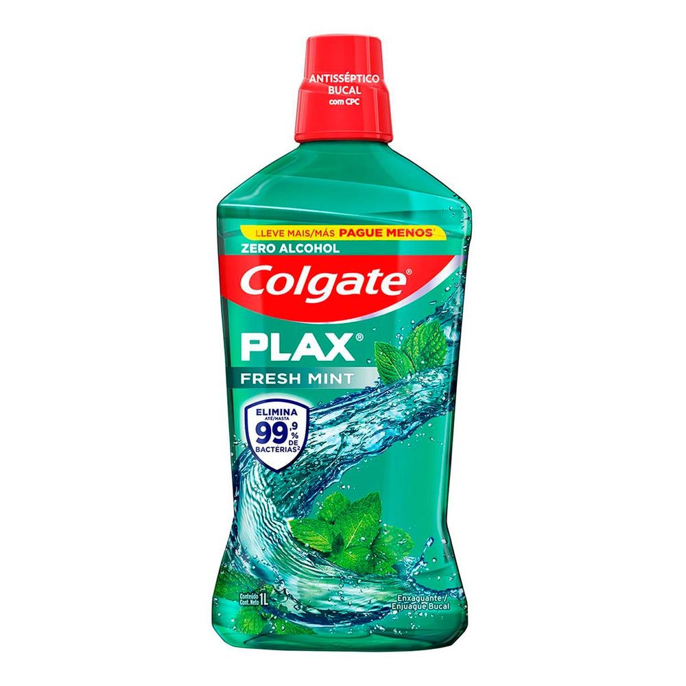 O Enxaguante Bucal Colgate Plax Fresh Mint é indicado para o cuidado da saúde bucal. O produto oferece proteção contra 99% dos germes que causam a placa bacteriana, cáries e mau hálito, proporcionando um hálito fresco. Não possui álcool. Uso diário. A embalagem contém 1000ml.