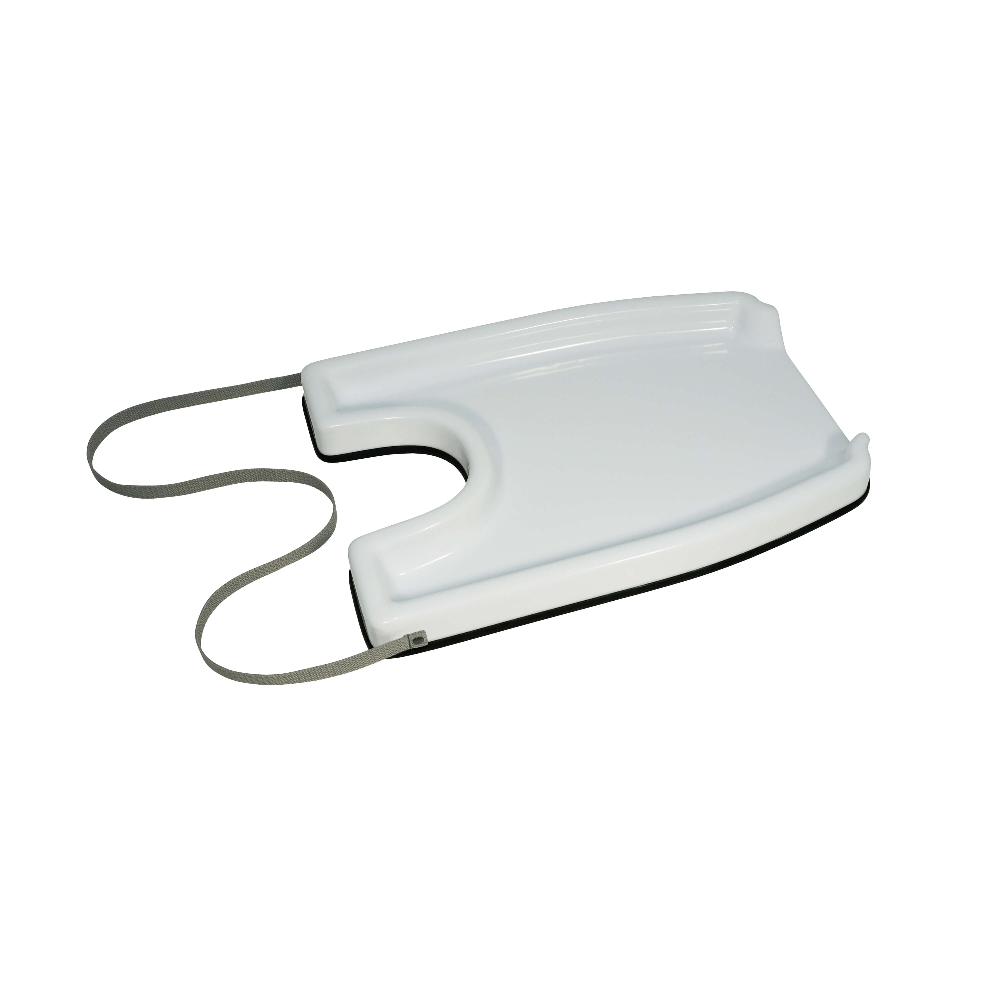 Compacto, leve e fácil de usar. Reduz a tensão nas costas para o cuidador. Cinta para envolver no antebraço do usuário para estabilizar a bandeja. Pode ser usada com cadeira ou cadeira de rodas. Medidas: 45cm x 32cm x 4cm Material: Plástico Cor: Branco