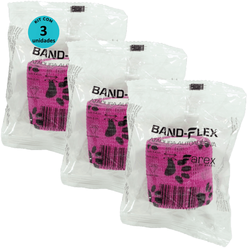 Atadura 5cm Rosa Com Patinhas Band-Flex Autoadesiva Para Animais Farex Kit Com 3