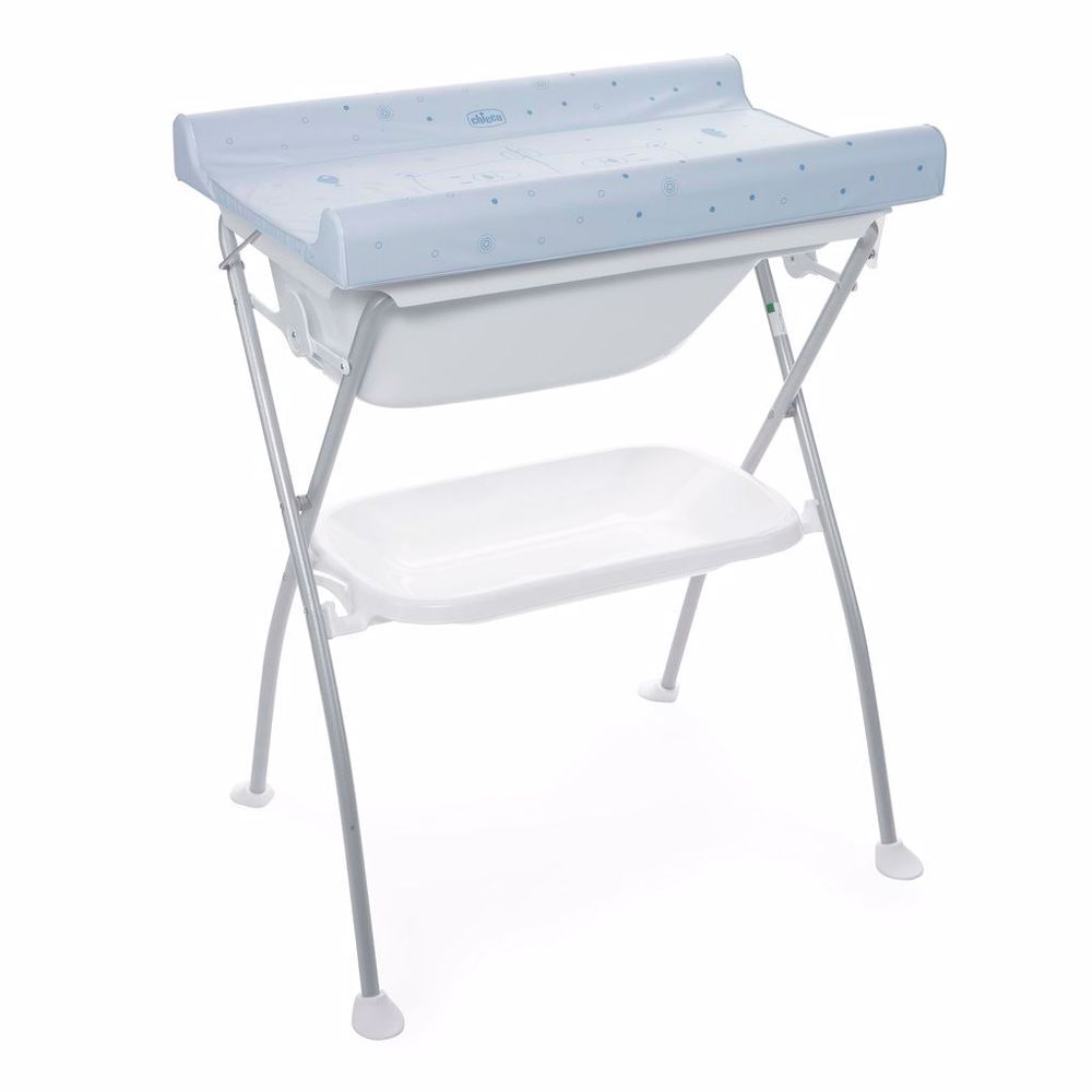 Prateleira Inferior de Arrumação: Espaço útil para guardar os produtos necessários para a muda e banho do bebé.