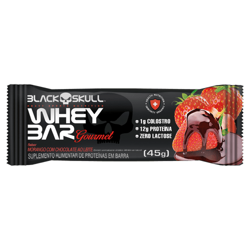 Barra de Proteína Black Skull Whey Bar Gourmet 12g Morango com Chocolate ao Leite Zero Lactose 45g