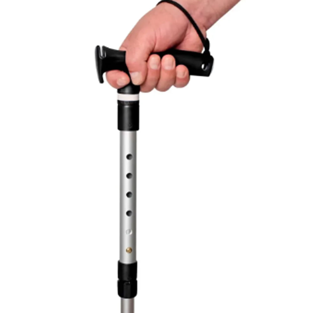 A Bengala Tipo T Dobrável foi desenvolvida para auxiliar pessoas com mobilidade reduzida, proporcionando apoio e estabilidade para prevenir quedas durante a caminhada. O recurso é resistente, leve e possui apoio de mão em formato tipo T, com maior área de pega que proporciona melhor distribuição da pressão palmar e redução da área que separa os dedos, evitando as chances de dores na mão e desconfortos durante o uso. O dispositivo é prático, podendo ser dobrado para guardar ou transportar quando não estiver em uso, conta com 6 níveis de ajuste de altura, alça para punho e suporte para apoiar pequenos objetos. Além disso, possui gancho para pendurar o produto e face plana para apoio em superfícies. A bengala contém ponteira articulada com sinalizador de desgaste e ranhuras que reduzem o risco de deslize em pisos com acúmulo de líquido, o que oferece uma passada mais natural e segura.
