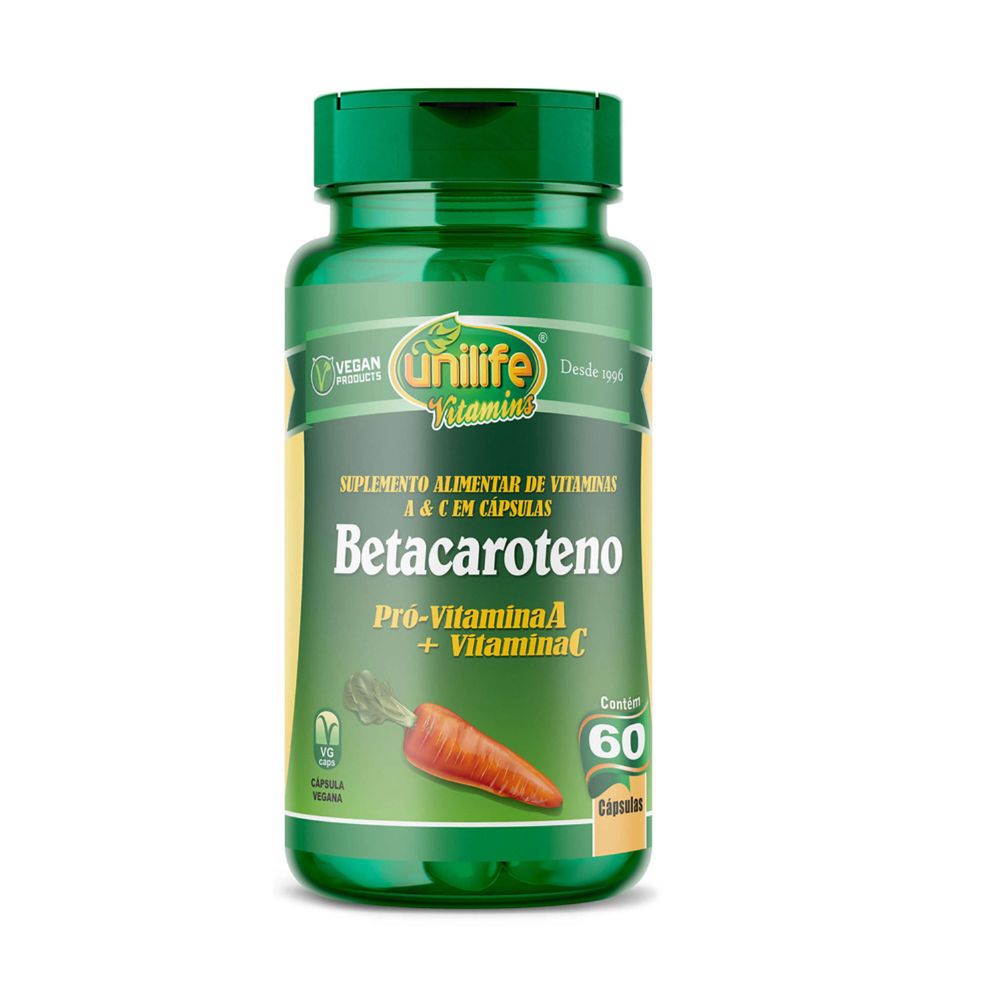 Betacaroteno Vitamina A E C 60 CAPS 500MG - Unilife O Betacaroteno Unilife Vitamins é um suplemento VEGANO, desenvolvido a partir de extrato de betacaroteno e ácido ascórbico revestido (vitamina C). Livre de glúten. Modo de uso: sugere-se a ingestão de 1 cápsula ao dia, após a principal refeição. Ingerir com líquido. Este produto não é um medicamento. Não exceder a recomendação diária de consumo indicada na embalagem. Manter fora do alcance de crianças.  Ingredientes: Ácido ascórbico revestido, betacaroteno em pó.Cápsula: gelatina vegetariana e água.