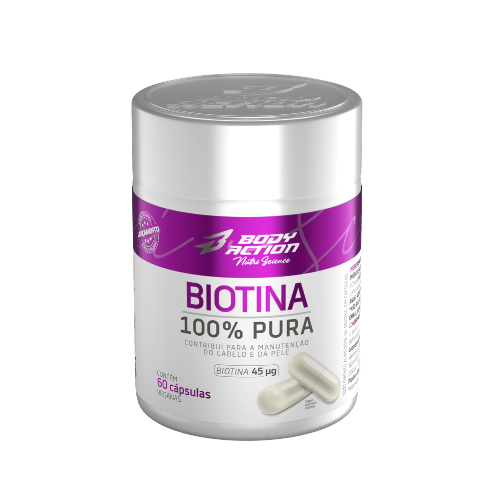 A Biotina 100% Pura Body Action é um suplemento alimentar à base de vitamina B7, essencial para a manutenção da saúde da pele, cabelos e unhas. Atua também no metabolismo de carboidratos, gorduras e proteínas, favorecendo a produção de energia e o bom funcionamento celular.BENEFÍCIOS DA BIOTINA DA BODY ACTIONFORTALECE PELE, UNHAS E CABELOSSAÚDE DA PELEENERGIA CELULARCOMO E QUANDO CONSUMIR A BIOTINA DA BODY ACTIONSugere-se a ingestão de uma cápsula ao dia ou conforme recomendação profissional.QUAIS CUIDADOS TOMAR?Mantenha fora do alcance de crianças.Este produto não é um medicamento.Este produto é indicado para maiores de 19 anos.Este produto não deve ser consumido por gestantes, lactantes e crianças.Não exceder a recomendação diária de consumo indicada na embalagem.COMO FAÇO PARA CONSERVÁ-LO?Manter em local fresco, não úmido e ao abrigo de luz. Não consumir o produto caso o lacre de proteção esteja violado.QUAL SUA COMPOSIÇÃO?Biotina (d-biotina) e Antiumectante Talco Farmacêutico. INGREDIENTES DA CÁPSULA: HPMC (hidroxipropilmetilcelulose), Água purificada e corante. NÃO CONTÉM GLÚTENAviso legal• Idade mínima recomendada: 18 anos.• Consumir junto com alimentos para facilitar sua assimilação.• Este produto é um suplemento dietético, não um medicamento. Suplementa dietas insuficientes. Consulte o seu médico e/ou farmacêutico.