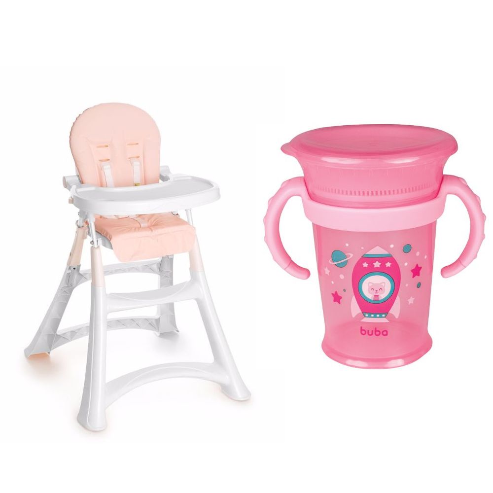 Cadeira de Refeição Alta Premium Galzerano Branca e Rosa + Copo de Treinamento 360º Com Alça Buba Re