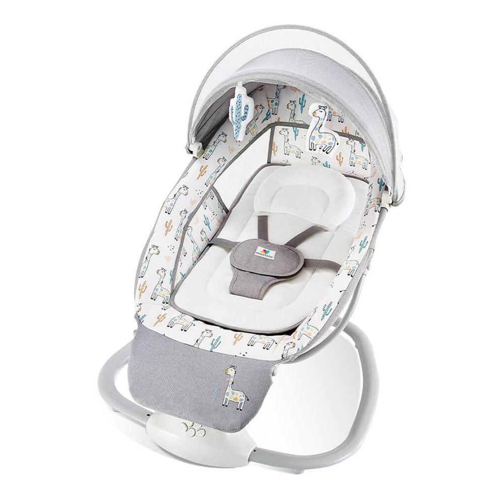 O balanço automático tem 3 timers: 15, 30 e 45 minutos. A cadeira também acompanha capota com rede mosquiteira integrada no móbile de brinquedos (2 brinquedos divertidos) e o encosto da cabeça se solta do forro almofadado em plush, para maior segurança o cinto ajustável é de 5 pontos.