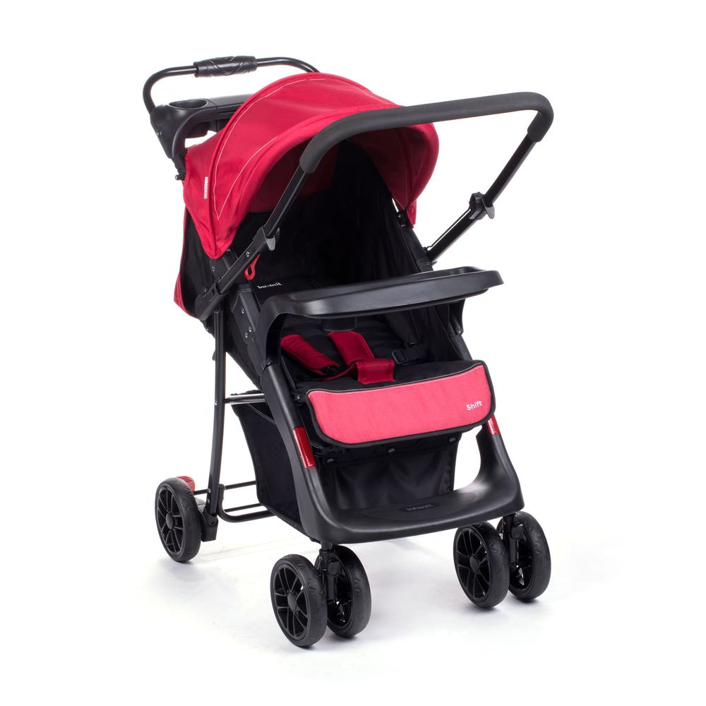 Carrinho de bebê com alça reversível, fechamento com apenas uma mão e assento com modo de descanso. Possui bandeja superior para os pais e frontal para a criança.