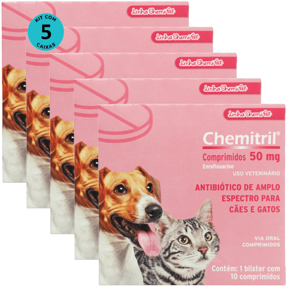 Chemitril 50mg Com 10 Comprimidos Para Cães e Gatos Chemitec Kit Com 5
