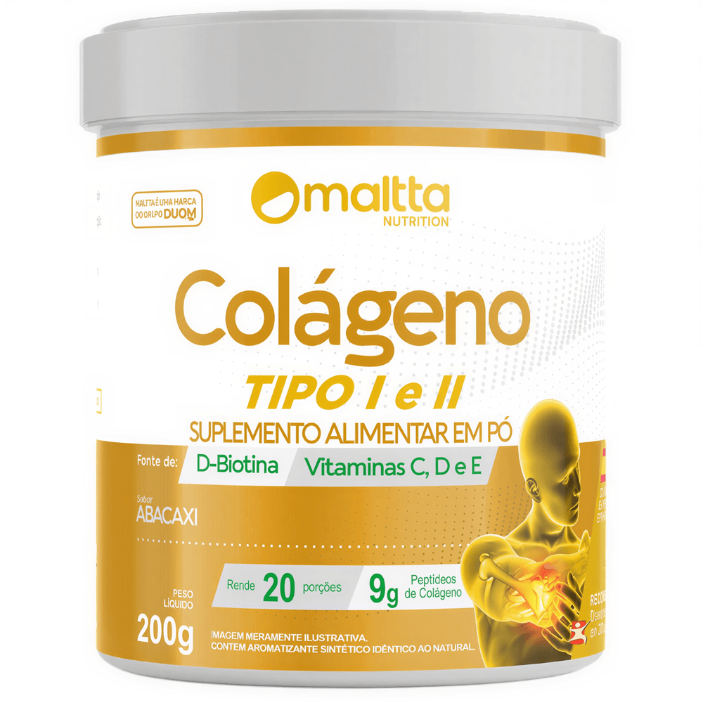 COLÁGENO TIPO 1 E 2 + BIOTINA + VITAMINAS E + C + D 200G ABACAXI - MALTTA NUTRITION — descrição — INDÚSTRIA DO CORPOColageno Tipo 1- Hidrolisado e Colágeno Tipo 2- Não desnaturado.O colágeno não desnaturado auxilia na manutenção da função articular.As proteínas auxiliam na formação dos músculos e ossos.A Biotina contribui para a manutenção do cabelo e pele.A Vitamina C e a Vitamina E são antioxidantes que auxiliam na proteção dos danos causados pelos radicais livres.A Vitamina C auxilia no funcionamento do sistema imune e na formação do colágeno.A vitamina D auxilia na absorção de cálcio e fósforo. — benefícios — INDÚSTRIA DO CORPO- Colágeno Hidrolisado Tipo I;- Colágeno não Desnaturado Tipo II;- Manutenção da função articular;- Auxilia na formação dos músculos e ossos;- Manutenção, crescimento, fortalecimento e melhora dos cabelos;- Manutenção e melhora da pele;- Combate aos radicais livres;- Melhora no funcionamento do sistema imunológico;- Auxilia na formação do colágeno;- Auxilia na absorção do cálcio e fósforo. — sugestão de uso — INDÚSTRIA DO CORPODissolver 1 colher de sopa rasa (10g) do Colágeno Tipo I e II Duom em 200ml de água. Misture até completa dissolução e consuma logo em seguida. — tabela nutricional — INDÚSTRIA DO CORPOEM ANEXO NAS IMAGENS. — composição — INDÚSTRIA DO CORPOColágeno Hidrolisado, Vitamina C, Colágeno Tipo II não desnaturado , Vitamina E (Acetato D-Alpha-Tocoferol), D-Biotina e Vitamina D3. Aroma Sintético de Abacaxi, Acidulante Ácido Cítrico, Antiumectante Dióxido de Silício e Edulcorante Artificial Sucralose. — recomendações —EM ANEXO NAS IMAGENS. — dados técnicos — INDÚSTRIA DO CORPOMarca – Duom.Conteúdo líquido por frasco – 200 g.Rendimento por frasco – 20 porções/doses.Peso líquido por frasco – 200 g.Código de barras (EAN) – 7898665750919.Registro ANVISA – Dispensado de registro de acordo com a resolução da RDC 27/2010 e RDC 240/2018 da ANVISA.Dimensões do produto – altura: 10 cm; largura: 6 cm; comprimento: 6 cm. — itens do anúncio — INDÚSTRIA DO CORPO1 Unidade do produto:COLÁGENO TIPO 1 E 2 + BIOTINA + VITAMINAS E + C + D 200G ABACAXI - MALTTA NUTRITION- Total – 200 g CADA POTE.