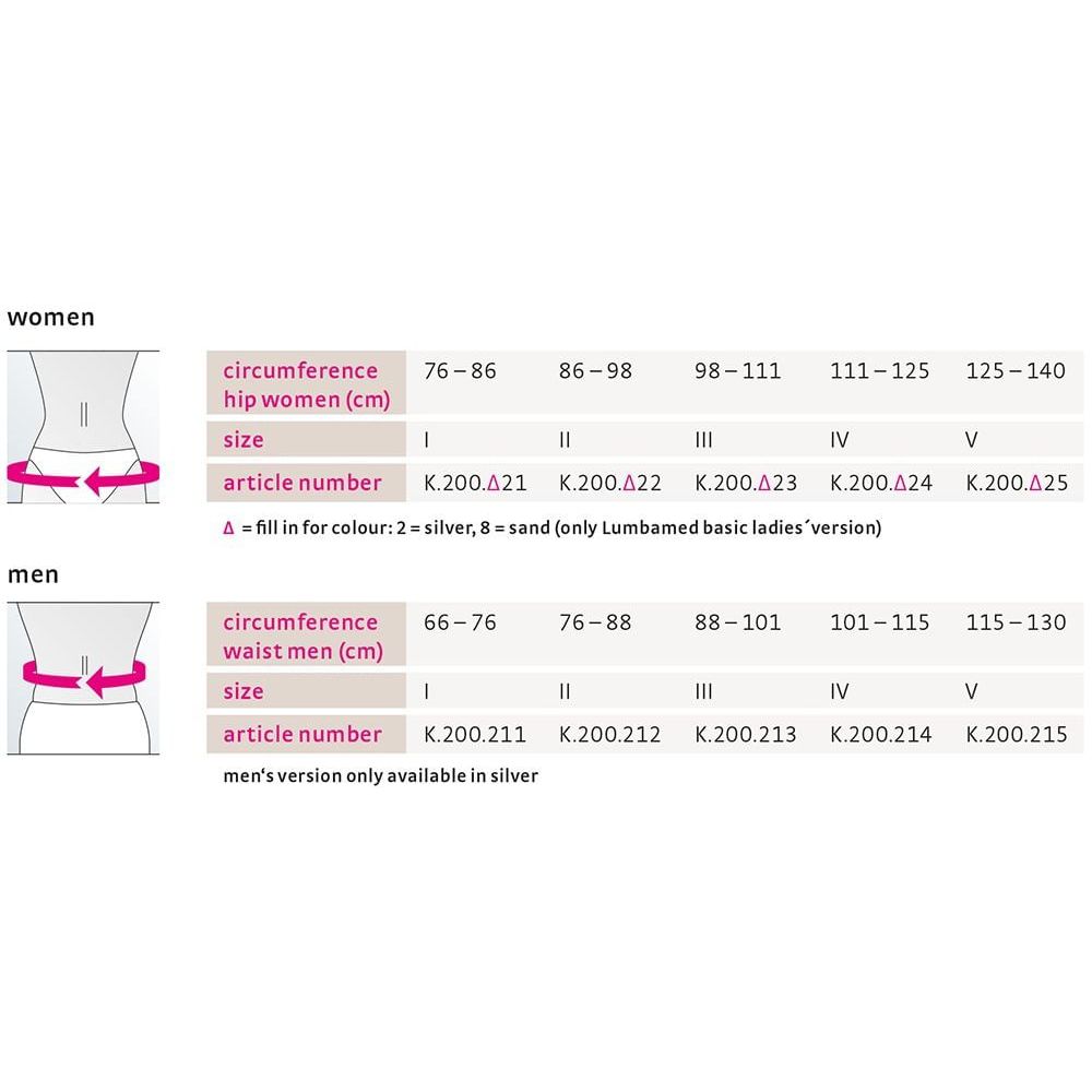Vantagens do produto Estabilização da área da coluna lombar e da transição lombossacral por meio de 4 reforços dorsais de mola integrados Redução da lordose da coluna lombar por meio de compressão proprioceptiva na área abdominal Como funciona?/Mecanismo de ação Por favor, note que o ajuste inicial deve ser supervisionado por um profissional de saúde. Com a combinação da malha de compressão e das hastes traseiras integrados, Lumbamed basic estabiliza a área da coluna lombar e a passagem para a pélvis, sem prejudicar a força muscular. As forças estáticas na coluna vertebral são melhoradas e o esforço exercido sobre os segmentos afetados é reduzido. Isso alivia a dor. Os apoios conseguem o maior efeito durante a atividade física. Em princípio, o apoio pode ser usado durante todo o dia. Porém, Isto depende do conforto que o usuário sente ao usar o apoio. Ele deve ser retirado durante longos períodos mais longos (p. ex., se ficar sentado muito tempo, ou em uma viagem longa de carro, durante o sono). Se você sentir dor excessiva ou desconforto durante o uso, retire o produto imediatamente e consulte um médico. Instruções para vestir/ajustar A etiqueta no lado direito dentro do fecho informa sobre como colocar o apoio. Primeiro, deslize para dentro da pulseira interna do lado esquerdo do fecho. Enrole a ligadura em torno do corpo e, em seguida, deslize para dentro da pulseira externa do lado direito. Puxe os dois lados de fecho um sobre o outro e, em seguida, prenda-os tão centralmente quanto possível com o velcro. A ligadura está aplicada corretamente se a extremidade inferior do fecho ficar localizada imediatamente acima da púbis. A guia do dedo mindinho, na borda do lado direito do fecho, irá ajudá-lo a retirar a ligadura novamente. O tecido de malha Clima Comfort consegue a sua melhor atividade de respiração quando a ligadura é usada diretamente sobre a pele. Componentes do material Poliamida, poliéster, elastano, viscose Instruções de lavagem Os fechos de velcro devem ser fechados para lavagem. Amaciador, gorduras, óleos e pomadas podem atacar o material e prejudicar o efeito Clima Comfort. Resíduos de sabão podem causar irritação da pele e desgaste do material. Lave o produto à mão, de preferência usando um detergente medi clean, ou no programa para roupa delicada, a 30°C, usando um detergente suave sem amaciadores. Não use lixívia. Deixe secar naturalmente. Não passe a ferro. Não limpe a seco. Indicações Dor não específica na área da coluna lombar Dor relacionada com desgaste na região da coluna lombar Irritação da articulação sacroilíaca Esforço excessivo exercido na passagem da coluna lombar para a pélvis Debilidade ou desequilíbrio dos músculos do tronco (costas ou abdômen) Afrouxamento da sínfise púbica Contraindicações absolutas Nenhum