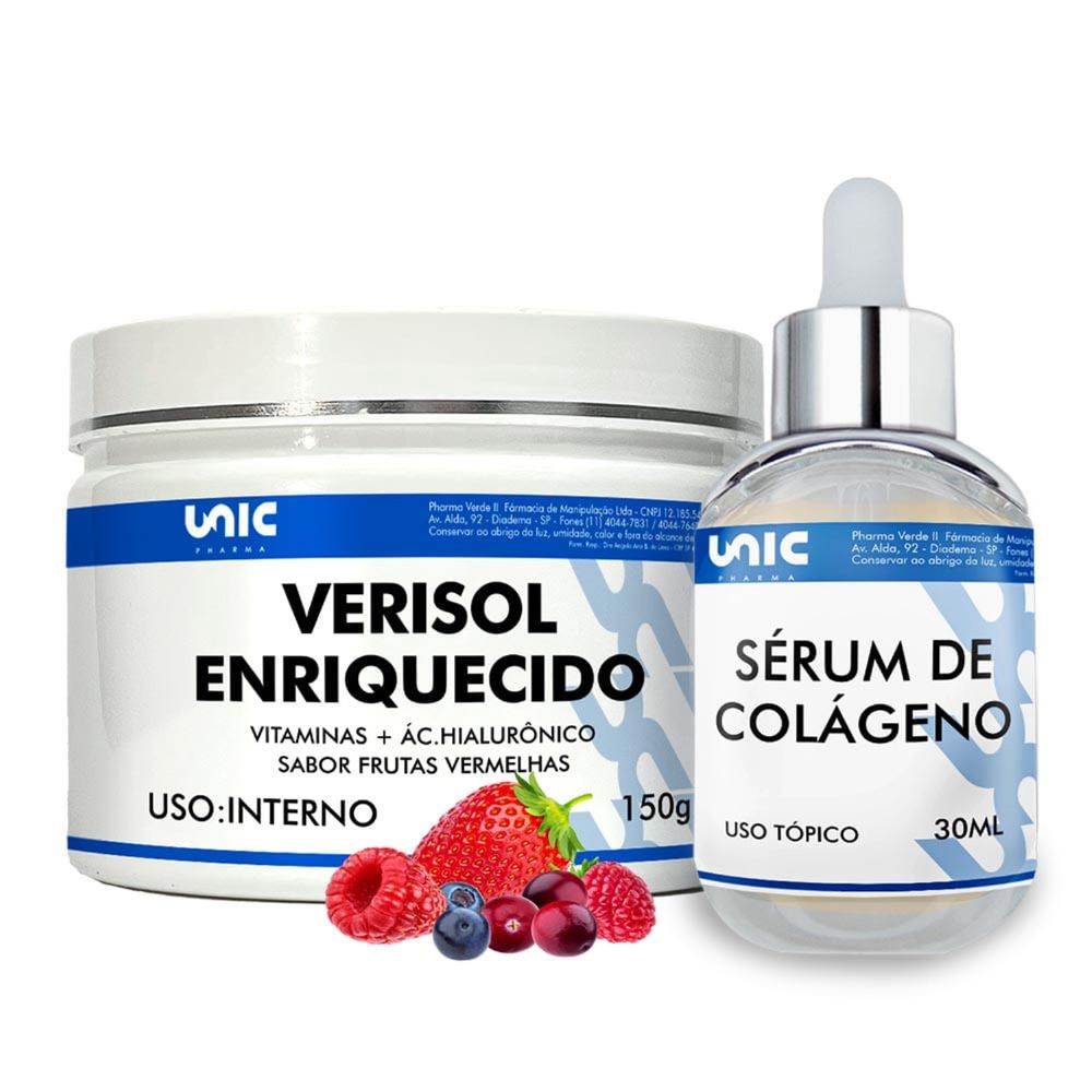 Combo de ColágenoCombo com Verisol Enriquecido e Sérum de Colágeno (Brilho, firmeza, preenchimento de rugas, efeito rejuvenescedor)Verisol Enriquecido: Verisol + Ácido Hialrônico Pó + Siliucimax + Vitamina C + Colágeno Hidrolisado - Sabor Frutas Vermelhas.Colágeno VerisolVERISOL® é um ingrediente inovador que atende aos principais requisitos das mulheres que buscam soluções eficazes anti-envelhecimento. Ele atua de dentro para fora, suavizando as rugas, aumentando a elasticidade e a hidratação da pele.O colágeno é uma das proteínas mais importantes do corpo humano, é um componente natural, responsável por dar firmeza à pele e corresponde a aproximadamente 80% do peso seco deste órgão. Durante o processo natural de envelhecimento, em associação com outros fatores ambientais e nutricionais, a derme, principal camada de atuação do VERISOL®, sofre com a perda de umidade e fica mais seca. Por conta disto, ela fica mais fina, a ligação do tecido conjuntivo perde sua firmeza e elasticidade, e as rugas aparecem. VERISOL® é produzido a partir de matérias-primas porcinas, bovinas ou marinhas.Melhora SignificativaA ingestão diária de VERISOL® estimula o metabolismo do colágeno da pele e seus resultados são observados de dentro para fora. Contribui para o retardamento dos sinais do envelhecimento da pele, desacelerando a formação de rugas e suavizando as já existentes.Maior Elasticidade da PeleO primeiro estudo científico feito com este ingrediente foi realizado com 69 mulheres entre 35 e 55 anos de idade. Ele revelou que a suplementação com VERISOL® contribui para um aumento significativo da elasticidade da pele – até 10% - em comparação com o tratamento realizado com placebo. Este resultado notável pôde ser observado após 4 semanas de ingestão diária de 2,5g do produto e persistiu após 8 semanas de administração do VERISOL®. Os níveis de elasticidade da pele continuaram a ser observados 4 semanas após a última ingestão de VERISOL®.Redução das RugasO segundo estudo científico foi realizado com mais de 100 mulheres com aproximadamente 55 anos de idade. Este estudo comprovou que a ingestão diária de 2,5g de VERISOL® por dia contribui também para uma redução significativa da profundidade das rugas após 4(quatro) semanas de uso.Aumento da Estrutura superficial da Pele e redulção da CeluliteVocê sabia que a celulite afeta mais de 85% da população adulta feminina no mundo? A celulite é um aspecto relacionado à beleza, não uma doença, mas muitas mulheres sofrem com essa imperfeição. A celulite é causada principalmente por distúrbios na matriz dérmica, em conjunto com o excesso de gordura subcutânea, formando saliências na derme, além de excesso de fluido intersticial.A suplementação com VERISOL® apresenta efeitos benéficos sobre a matriz extracelular da pele e pode ajudar a reduzir a celulite. Ao contrário de suplementos atuais contra a celulite, que tratam principalmente os aspectos da gordura excessiva ou microcirculação/drenagem, o VERISOL® estimula diretamente a formação da matriz extracelular na pele.O que é Ácido Hialurônico?O Ácido Hialurônico é um ativo produzido naturalmente pelo corpo que possui propriedades hidratantes e estimulantes de colágeno. É encontrado no organismo, mas com o passar do tempo sua produção diminui, precisando ser reposto em formato de tratamento, através de aplicações tópicas ou injetáveis.O Ácido Hialurônico para o rosto ajuda a manter a sustentação e a hidratação da pele, evitando a flacidez, as linhas e sinais de expressão, preenchendo e mantendo a pele hidratada, viçosa e revitalizada. Por ser um componente natural do nosso organismo essa substância não é rejeitada pela pele!A diminuição da produção natural de Ácido Hialurônico, que ocorre a partir dos 25 anos de idade, afeta diretamente a pele, ocasionando o aparecimento das rugas, da flacidez e a perda do viço.Repor esse ativo é fundamental e deve ser feito assim que os primeiros sinais de envelhecimento surgirem com dermocosméticos que utilizam a substância em sua formulação.Combate às rugas e linhas de expressãoExistem dois tipos de rugas: dinâmicas, que são causadas pelo movimento dos músculos faciais constantes, e estáticas, que ficam visíveis mesmo quando não movimentamos os músculos do nosso rosto.As rugas surgem com a diminuição da produção de colágeno e Ácido Hialurônico em nosso corpo, que são responsáveis pela firmeza e preenchimento, consequência do envelhecimento natural da pele. Além disso, fatores externos como exposição solar sem proteção, má alimentação e vícios, como o fumo, também influenciam.Para combater as rugas e linhas de expressão, o Ácido Hialurônico para o rosto pode ser usado em forma de dermocosméticos, ou por meio de procedimentos minimamente invasivos, suavizando esses sinais da idade. Saiba mais sobre como usar o Ácido Hialurônico na pele!SiliciumaxSiliciuMax® promove uma ação detoxificante por um processo de “limpeza” celular, eliminando e bioconvertendo proteínas insolúveis, agregados de macromoléculas, lipídios oxidados e organelas danificadas, evitando assim o acúmulo de componentes degradados no interior da célula e promovendo a longevidade celular. Em conjunto com outros ativos esse processo é fortalecido e protege ainda mais a sua pele, cabelos e unhas. Portanto, SiliciuMax e Componentes é feito para você que deseja uma pele, cabelos e unhas fortes e brilhantes.Vitamina CA Vitamina C possui uma ação antioxidante forte e eficaz, que ajuda na produção de colágeno e colabora na diminuição dos radicais livres, além de ter ação inibidora na formação de melanina, o que beneficia a luminosidade da pele, deixando-a mais viçosa, bonita e com aparência saudável.Colágeno HidrolisadoO colágeno hidrolisado promete fazer uma reposição do colágeno na pele, proteína que produzimos de forma