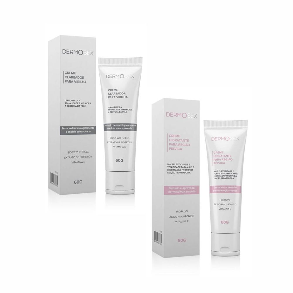 De acordo com a ANVISA, os dermocosméticos são produtos que em sua composição possui substâncias e ativos terapêuticos que além da epiderme, atingem as camadas mais profundas da pele, garantindo um melhor resultado, como no tratamento anti-idade. Ou seja, promove alterações fisiológicas e melhoram a aparência da pele.Os cosméticos tradicionais funcionam com ação instantânea, mas não atuam nas reais causas destes problemas, os dermocosméticos passam por testes e pesquisas científicas garantindo a segurança e eficácia. Pensando nisso, e na crescente busca de produtos para skincare, a A Sós não poderia deixar de te apoiar no cuidado e tratamento da pele da sua região íntima. Após muitos testes, chegaram à linha DermoSex, revolucionário conceito de cuidados íntimos.--------------------------------------------------------------------INFORMAÇÕES SOBRE O CLAREADOR:O Creme Clareador Intimo para Virilha Dermosex é para uso unissex. Creme para aplicação corporal que clareia e uniformiza o tom da pele, principalmente na área das virilha.  Principais benefícios:Ação calmantePele das axilas e virilhas mais claras e com o tom uniformePode ser usado no verãoMelhora a cicatrizaçãoAumenta a firmeza da pele, já que participa da formação do colágenoAge como hidratante potente para a pele  Ativos do produto:Bioex WhiteplexExtrato de BiofoetidaVitamina E REGISTRO ANVISA: AFE 2.03.200-7 N° Processo 25351.036147/2020-31-----------------------------------------------------------------------INFORMAÇÕES SOBRE O HIDRATANTE:Creme hidratante para região Pélvica hidrata intensamente todos os tipos de pele graças à sua combinação única de Hidralys e ácido hialurônico. Este creme ultra-concentrado proporciona hidratação de até 48 horas, acalma e protege a pele. Desde a primeira aplicação, os sentimentos de desconforto são reduzidos. A pele fica fresca, macia, cheia e radiante. Fórmula com 96% de ingredientes de origem natural e sem parabenos. Pele hidratada e acalmada profundamente. Promove mais elasticidade e tonicidade para a pele. Hidratação profunda e ação reparadora.Principais Benefícios:Ação calmanteHidratação profundaAção reparadoraMelhora tonicidadeEfeito calmantePossui Hidralys, Ácido hialurônico e Vitamina E Ativos do Produto:HidralysÁcido HilaurônicoREGISTRO ANVISA: AFE 2.07995-0 / N° PROCESSO: 25351.032917/2020-76Prinicpais Tags de Pesquisa:estetica intima feminina, estetica intima, estética intima feminina, estetica intima clareamento, como deixar a virilha bonita, como ter uma virilha bonita, como ficar com a virilha bonita, como deixar a pele da virilha bonita, mancha virilha clarear, como clarear virilha escura, como clarear a pele da virilha