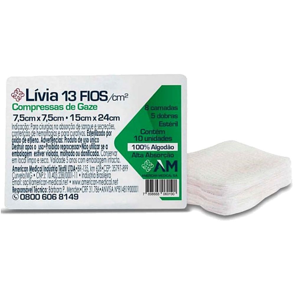 Compressa Gaze Estéril 13 Fios Lívia - 7,5 x 7,5 cm - Com 10 compressas