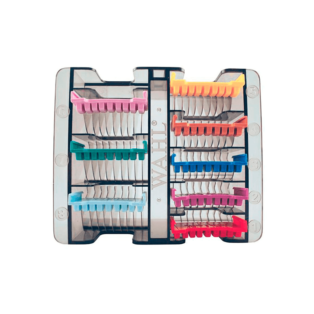 Conjunto de pentes adaptadores de altura compatíveis com a máquina de tosa bravura estojo para armazenagem dos pentes com sistema de cores que facilita a identificação do produto economia de até 25 minutos no tempo total de tosa.