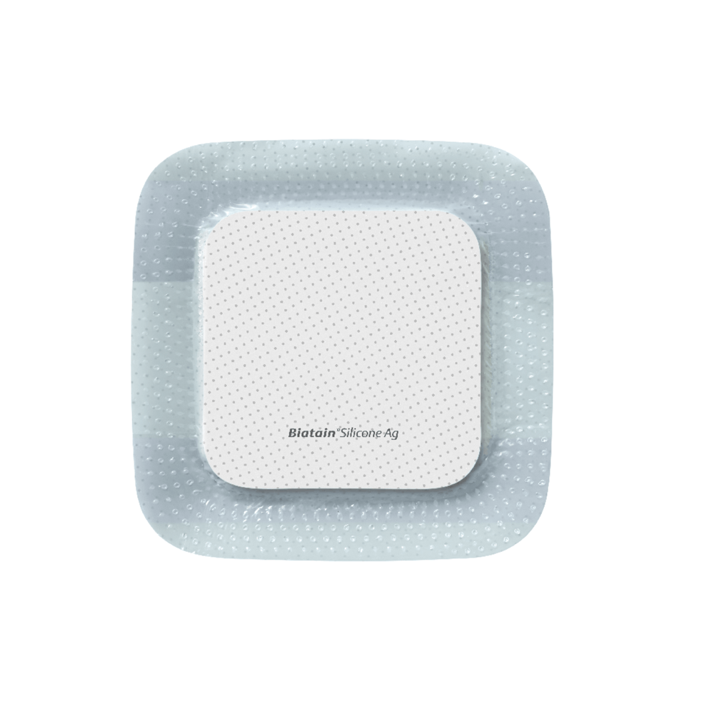 O Curativo Silicone e Prata 10x10cm Biatain Silicone AG - Coloplast 39637 é um curativo de espuma com complexo de prata patenteado, com amplo espectro antimicrobiano. Destina-se à cicatrização de feridas em ambiente úmido e ao controle de exsudato de feridas com cicatrização retardada devido a bactérias, ou nas quais há risco de infecção. Conforma-se ao leito da ferida: O Biatain Ag conforma-se ao leito da ferida para reduzir o acúmulo de exsudato e fornecer prata ao leito da ferida; Absorve verticalmente: Os microcapilares dentro da espuma absorvem o exsudato verticalmente, desencadeando a liberação de prata; Retém o exsudato: O exsudato é retido mesmo sob compressão, reduzindo o risco de maceração e a disseminação de infecção nas bordas e na pele perilesional da ferida; Mata 99,99% dos biofilmes maduros: Além de prevenir a formação de biofilmes (mostrado in vitro), são eficazes contra um amplo espectro de bactérias e fungos por até 7 dias.