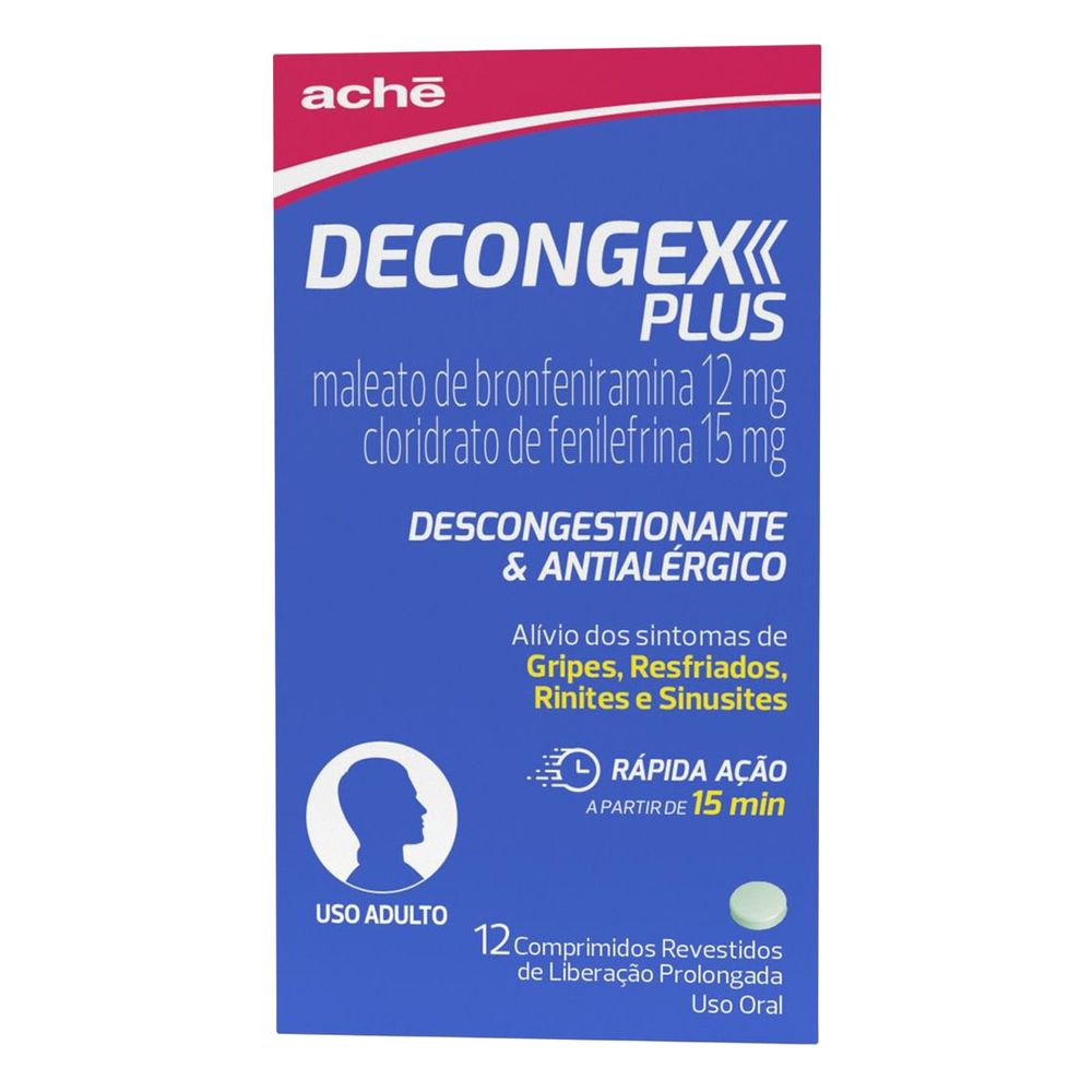 Decongex Plus Aché é um medicamento que combina a ação de descongestionante nasal com antialérgico, indicado para aliviar os sintomas associados a gripe, resfriado, rinite e sinusite, reduzindo o excesso de secreção e aliviando a congestão nasal. Embalagem com 12 comprimidos revestidos.