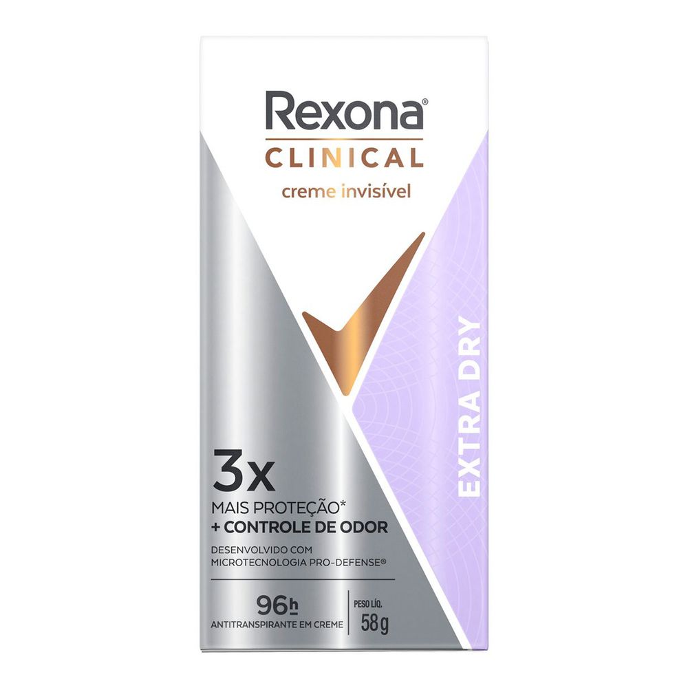 Descubra a proteção poderosa e duradoura do Rexona Clinical Creme Invisível Extra Dry, o desodorante antitranspirante em creme desenvolvido para quem precisa de performance máxima no dia a dia, sem abrir mão de conforto e cuidado com a pele e com as roupas. Com 96 horas de proteção antitranspirante, ele proporciona uma sensação refrescante duradoura, mesmo nos momentos mais intensos. Sua fórmula exclusiva oferece 3x mais proteção* contra o suor em comparação com um antitranspirante comum, além de controlar o mau odor. Com a avançada microtecnologia Pro-Defense, Rexona Clinical atua em sintonia com seu corpo, oferecendo uma resposta de tripla ação: previne o suor com nosso ativo mais potente, neutraliza o mau odor com liberação de ativos conforme o movimento, e refresca com moléculas de fragrância ativadas pelo suor — mantendo você limpa, fresca e protegida durante todo o dia, mesmo em situações de calor, estresse ou esforço físico. Além da performance, Rexona Clinical é dermatologicamente testado: poderoso na proteção, suave com a pele. Sua fragrância floral e revitalizante, com notas de frésia, lírio e cedro, é liberada gradualmente por cápsulas de liberação prolongada, garantindo frescor contínuo e sensação de limpeza por muito mais tempo. O formato em creme possui textura leve com aplicação invisível, prevenindo manchas brancas nas roupas, além de secar rápido, não deixando sensação pegajosa na pele. A aplicação noturna também é recomendada: a fórmula é ativada enquanto dorme, entregando proteção ao longo do dia seguinte. *Vs. um antitranspirante básico.