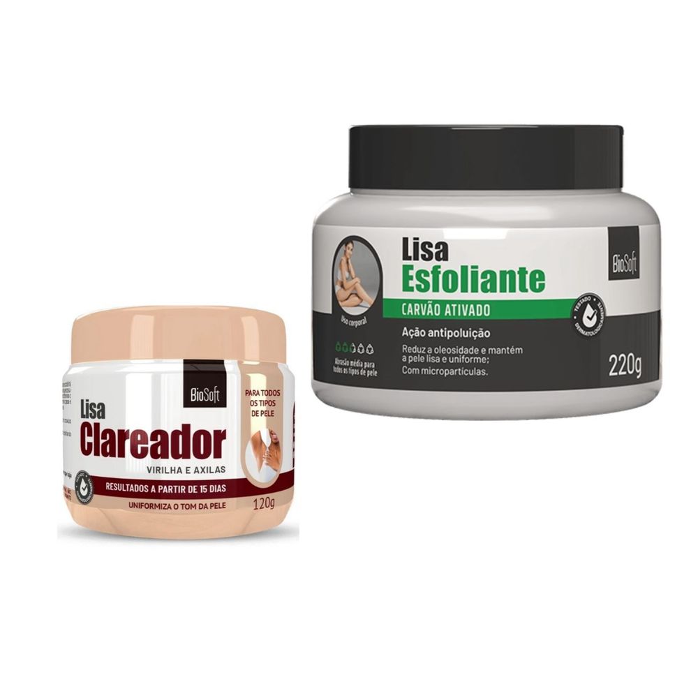 Você está cansado de se preocupar com manchas escuras corporais como na virilha e axila? O Kit com Clareador Lisa e o Esfoliante Carvão Ativado da Bio Soft é a solução perfeita para deixar essas áreas delicadas mais claras, suaves e livres de imperfeições.O poder esfoliante remove as células mortas, limpando profundamente a pele e permitindo que os ingredientes clareadores atuem de forma eficaz.Adeus, manchas indesejadas!Como usar o kit?O Esfoliante Carvão Ativado deverá ser utilizado no máximo duas vezes na semana na área desejada e o Creme Clareador Lisa toda noite antes de dormir até que os resultados sejam obtidos.É importante não expor a área ao sol e utilizar o filtro solar. Veja a seguir as informações de cada produto individualmente:------------------------------------CLAREADOR LISA BIO SOFT 120gVocê sabia que o uso de lâminas, roupas apertadas, alergia e fricção na pele são algumas das inúmeras causas de aparecimento de manchas escuras no corpo? Se você está sofrendo com manchas escuras na região da virilha, axilas, cotovelo, joelhos, entre coxas e no corpo em geral, você precisa conhecer o Lisa Clareador da Bio Soft.O Creme Clareador Íntimo Lisa Bio Soft é indicado para o uso nas áreas íntimas e corporais que apresentam hiperpigmentação pós- inflamatória onde a pele acaba produzindo mais melanina e escurece a região.O ativo principal do Clareador Íntimo Lisa Bio Soft é extraído do Gengibre Chinês, matéria prima que possui tripla ação clareadora, uma vez que atua em três fenômenos associados à pigmentação da pele: Formação do melanossomo, síntese de melanina e o transporte do melanossomo. O uso contínuo e correto conforme a orientação de uso, oferece um clareamento gradual e homogeneização da tonalidade da pele. Além disso, reduz a aparência opaca e escura da região aplicada deixando a pele luminosa e uniforme. Lisa Clareador ajuda a hidratar a região e a prevenir a formação de novas manchas.Um tratamento que pode ser feito em casa, diariamente, de forma simples e prática.ATENÇÃO: Produto destinado a pele de regiões secas. Não utilize na região Interna Íntima ou de mucosa, por serem regiões mais sensíveis do corpo.PROCESSO ANVISA: 25351.455102/2021-42 AFE 208433-4-------------------------------------------ESFOLIANTE CARVÃO ATIVADO BIO SOFT 220gA poluição prejudica a pele de diversas formas, principalmente porque favorece o envelhecimento precoce e a obstrução de poros contribuindo para o aparecimento de cravos e espinhas.Quer deixar sua pele macia, suave e livre de impurezas? Então experimente o Esfoliante Carvão Ativado Bio Soft com sua ação poderosa e inovadora que ajuda a reduzir a oleosidade excessiva da pele. Possui ação anti poluição, promovendo uma esfoliação profunda, eliminando as células mortas e todas as impurezas causadas pela exposição à poluição diária. Além disso, oferece ação clareadora.Sobre o Ativo Carvão Ativado: O carvão ativado é bastante poroso, tem alta capacidade de absorção e é muito utilizado em casos de intoxicação. Sua composição química tem muita afinidade com agentes oleosos, por isso é um componente fácil de ser encontrado em produtos de combate à oleosidade da pele. Não perca mais tempo com esfoliantes comuns. Experimente agora mesmo o Esfoliante Carvão Ativado Bio Soft e sinta a diferença na sua pele desde a primeira aplicação!INDICAÇÃO: Indicado para todo corpo, exceto o rosto. Utilize no máximo 2x na semana e em conjunto com os Cremes Hidratantes da marca Bio Soft.PROCESSO ANVISA: 25351.701425/2017-18 AUT/MS 201236-1---------------------------------------------------Principais Tags de Pesquisa:Esfoliante clareador para virilha, Esfoliante clareador para axilas e virilha, Esfoliante clareador íntimo, Esfoliante clareador para áreas escuras, Esfoliante clareador para região íntima, Esfoliante clareador para entrepernas