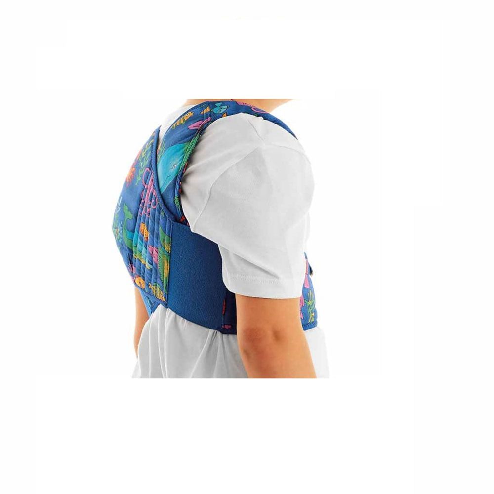 Indicado para auxiliar no controle da cifose torácica postural. Características Confeccionada com tecido brim (100% algodão) estampado e elástico resistente. Abrange toda a região superior das costas, promovendo o realinhamento das escápulas e melhora a postura da criança. Fecho frontal em Velcro® que permite ajuste preciso e adequado. Produto lavável. Tamanho Medida (cm) 1 53-58 2 59-64