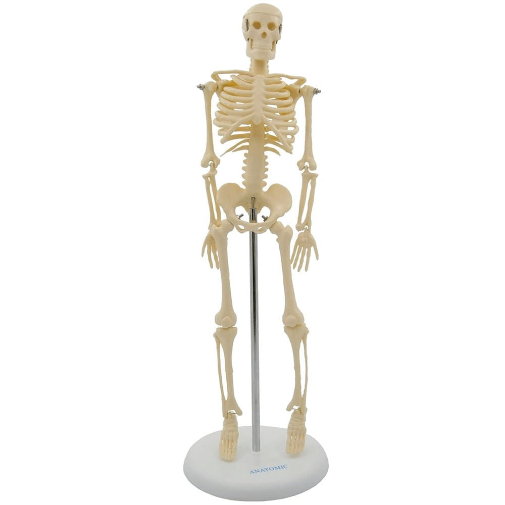 Modelo de esqueleto padrão, articulado com aproximadamente 85cm de altura. Confeccionado em resina plástica rígida na cor natural.