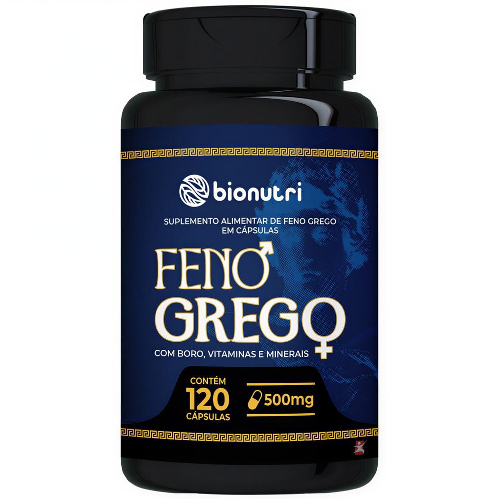 Suplemento alimentar de Feno Grego em cápsulasSUGESTÃO DE USO2 cápsulas ao dia.COMPOSIÇÃO – INGREDIENTESExtrato de Semente de Feno Grego (Trigonella Foenum- Graecum L), Vitamina B6 (Piridoxina), Vitamina C (Ác. Ascórbico), Vitamina B12 (Metilcobalamina), L - Arginina, Selênio, Boro, Zinco, Extrato de Poupa de Oliva (Óleo Europaea L.) e Extrato de Cacau (Theobroma Cacao L.). antiumectante: celulose microcristalina e fosfato tricálcico, lubrificante: silicato de magnésio.Composição Da Cápsula: Gelatina, umectante glicerina e água purificada.NÃO CONTÉM GLÚTEN.RECOMENDAÇÕESCRIANÇAS, GESTANTES, NUTRIZES, IDOSOS E PORTADORES DE ENFERMIDADES DEVEM CONSULTAR O MÉDICO OU NUTRICIONISTA ANTES DE CONSUMIR ESTE PRODUTO. O MINISTÉRIO DA SAÚDE ADVERTE: NÃO EXISTEM EVIDÊNCIAS CIENTÍFICAS COMPROVADAS DE QUE ESTE ALIMENTO PREVINA, TRATE OU CURE DOENÇAS.CONSERVAÇÃOConservar em local fresco e arejado ao abrigo de luz, calor e umidade.DADOS TÉCNICOSRegistro ANVISA – Produto dispensado de registro no Ministério da Saúde conforme RDC ANVISA 23/2000 e 27/10.Marca – Bionutri.Conteúdo líquido total – 120 cápsulas.Rendimento líquido total – 60 doses/porções.Peso líquido total – 60g.Peso bruto total – 120g.Peso produto + embalagem (aproximado) – 150g.Código de barras (EAN) – 7908854800193.Dimensões do produto – altura 11cm; largura 6cm; comprimento 4,5cm.Dimensões da embalagem padrão – altura 7cm; largura 13cm; comprimento 16cm.