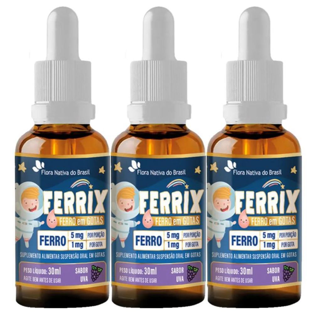 Ferro Em Gotas Ferrix Kids 3 X 30ml Flora Nativa Sabor Uva