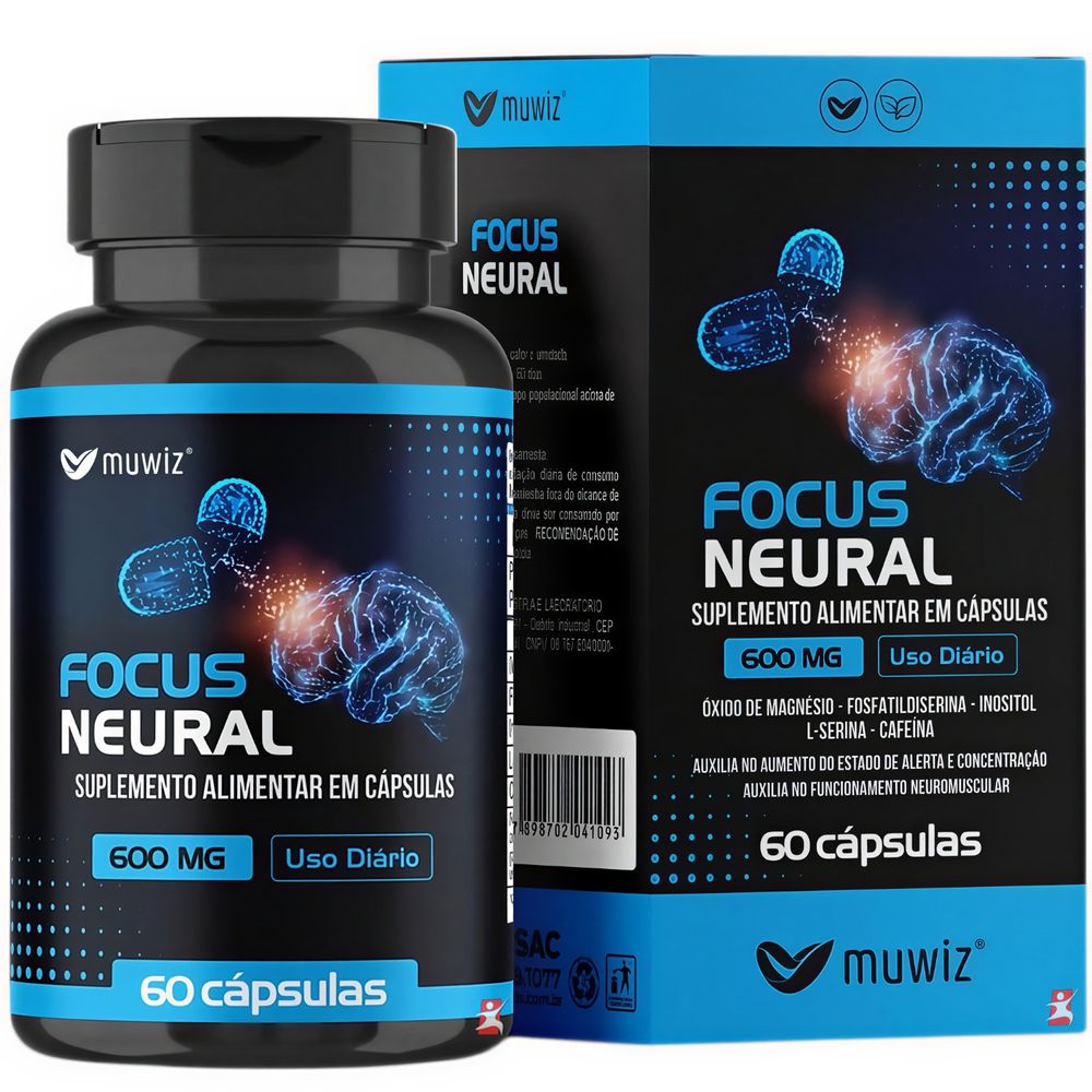 DESCRIÇÃOFocus Neural 600mg da Muwiz é um suplemento alimentar desenvolvido para apoiar o desempenho cognitivo, o estado de alerta e a concentração. Sua fórmula avançada reúne nutrientes como fosfatidilserina, inositol, óxido de magnésio, L-serina e cafeína — ingredientes comumente associados à função cerebral e ao equilíbrio neuromuscular. Indicado para pessoas que buscam mais foco no trabalho, estudos ou atividades de alto desempenho mental, Focus Neural é uma escolha prática para o dia a dia. BENEFÍCIOS NUTRICIONAIS- Auxilia no aumento do foco e concentração;- Contribui para a redução da fadiga mental;- Suporte ao desempenho neuromuscular;- Ideal para momentos de alta demanda cognitiva. RECOMENDAÇÃO DE USOIngerir 2 cápsulas ao dia, preferencialmente pela manhã, ou conforme orientação de médico ou nutricionista. TABELA NUTRICIONAL - COMPOSIÇÃO - RECOMENDAÇÕES & CUIDADOSAnexo nas imagens do anúncio. REGISTRO ANVISAProduto dispensado de registro conforme RDC 240/2018.
