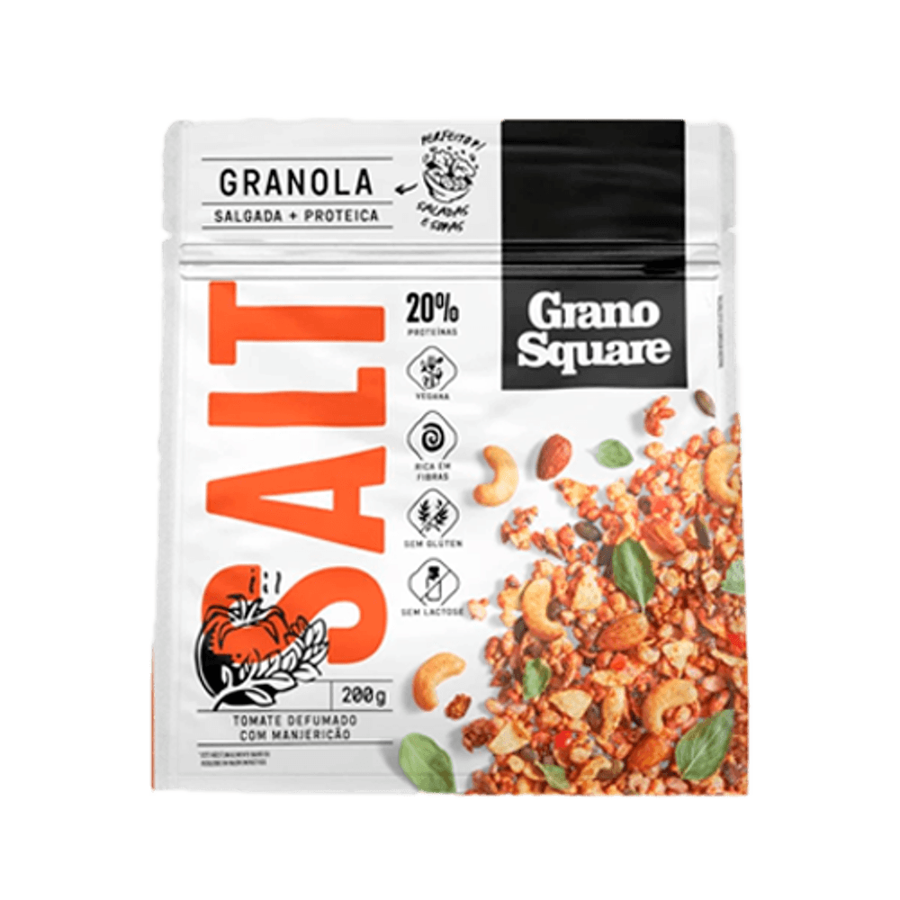 A Granola Salt Tomate com Manjericão GranoSquare é a escolha perfeita para adicionar um toque saudável e delicioso a saladas, sopas e cremes.  A Granola Salt Tomate com Manjericão GranoSquare é rica em proteínas veganas e fibras, contribuindo para refeições equilibradas que proporcionam saciedade prolongada. Uma escolha inteligente para quem busca sabor e bem-estar em cada refeição. Ingredientes: Mix de sementes (girassol, abóbora, linhaça e gergelim preto), mix de cereais (flocos de arroz e milho), fibra de tapioca, mix de flocos proteicos (proteína texturizada de ervilha e crispies de quinoa), mix de nuts (castanha de caju e amêndoa), tomate desidratado, óleo de coco virgem, manjericão liofilizado, sementes de urucum em pó, sal marinho, extrato de levedura, extrato de alecrim e aromas naturais. NÃO CONTÉM GLÚTEN.CONTÉM CASTANHA DE CAJU E AMÊNDOA. PODE CONTER CASTANHA DO PARÁ, NOZES E AMENDOIM.  Sobre a marca: GranoSquare foi criada com muito amor e carinho desde o início.Uma receita única, desenvolvida dentro da nossa casa para agradar à um marido devorador de granolas!O resultado foi tão surpreendente e delicioso que logo caiu no gosto de toda família e dos amigos e hoje, 9 anos depois, no de milhares de brasileiros que a devoram diariamente.Nos demos conta de que mudamos o mercado nacional de granolas. Nos tornamos referência e conseguimos inspirar até grandes marcas que já existem há muito tempo.Isso é incrível e nos deixa muito realizados!Temos paixão por GRANOLA por ser um alimento nutritivo, saudável, versátil, prático, que a gente torna extremamente saboroso e faz todo mundo querer comer todos dias em diversos momentos!Da nossa casa, para sua casa e para o mundo! Essa é nossa história, esse é o nosso sonho! Sobre a Boomi: A Boomi é  um mercado online com produtos saudáveis e sustentáveis, que fazem bem à saúde e ao planeta. São mais de 3.500 produtos de 150 pequenas marcas para você!Nascemos pequenos, mas com um propósito gigante: conectar pessoas a produtos acessíveis que tragam benefícios para a saúde, para o planeta e para a sociedade. Para isso, buscamos ofertar produtos de pequenos agricultores e pequenas empresas em um mundo cada vez mais veloz e que busca mais produtividade. Vamos sempre buscar levar o melhor para você!Nosso propósito é conectar alimentos saudáveis e produtos naturais e sustentáveis a pessoas preocupadas com a sua saúde e com a saúde do planeta. Com preço justo, comodidade e informações confiáveis.Curadoria: Nossos produtos são criteriosamente validados pela nossa curadoria de produtos saudáveis, que busca produtores e empresas que compartilham do nosso alto padrão de qualidade. Da enorme lista de ingredientes banidos à preocupação do bem estar animal, desde o primeiro dia seguimos fieis aos nossos valores, trabalhando com transparência e práticas sustentáveis. Vendemos apenas produtos que admiramos e que nos orgulha.