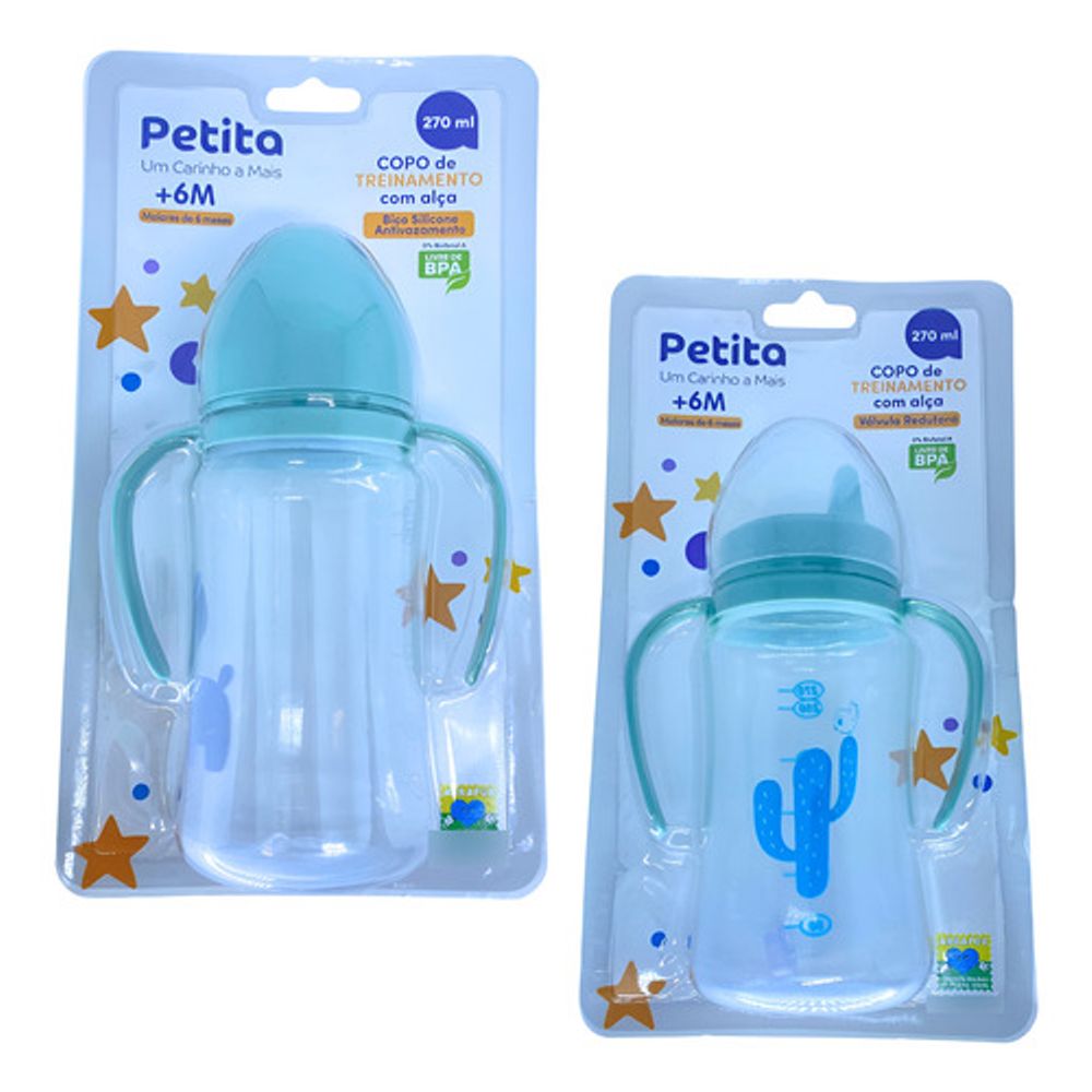 Kit Copos de Treinamento Infantil 270ml – Petita com Bico de Silicone Macio e Bico RígidoO kit copos de treinamento Petita é a escolha ideal para a fase de transição da mamadeira para o copo. Desenvolvido para oferecer segurança, conforto e praticidade, ele acompanha todas as etapas do desenvolvimento do bebê, garantindo autonomia com produtos de alta qualidade.Este kit de copos de transição vem com dois modelos diferentes, perfeitos para cada fase do aprendizado:Copo de treinamento com bico de silicone macio: delicado e confortável, lembra a sensação da mamadeira e protege as gengivas sensíveis.Copo de treinamento com bico rígido: resistente e durável, ideal para a etapa final da transição, ajudando a criança a se adaptar ao copo comum.Benefícios do Kit Copos de Treinamento PetitaCopo infantil completo: acompanha copinho de treino com bico macio e copo de aprendizado com bico rígido.Sistema copo antiderrame com válvula antivazamento, evitando sujeira e desperdício.Produzido em plástico seguro e material de qualidade, totalmente livre de BPA.Copo com alça e alças ergonômicas, fáceis de segurar por mãos pequenas.Estrutura leve, resistente e fácil de higienizar.Capacidade ideal: 270ml cada copo.Funciona como copo para bebê e copo para aprender a beber em todas as fases.Especificações do ProdutoKit com 2 copos de 270ml (1 bico de silicone macio + 1 bico rígido)Materiais: plástico seguro e siliconeIdade recomendada: acima de 6 mesesVálvula antivazamentoEstrutura leve e prática para o dia a diaPor que escolher o Kit Copos de Treinamento Infantil Petita?Com esse kit, seu bebê terá o copo de transição certo para cada momento. O modelo com bico macio é perfeito para as primeiras tentativas, enquanto o copo rígido ajuda na adaptação ao copo comum.Garanta já o kit copos de treinamento infantil Petita 270ml e proporcione ao seu filho uma transição tranquila, saudável e segura, com muito mais praticidade para o dia a dia.