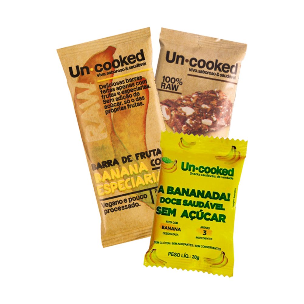 Kit 3 Doces de Banana Uncooked: Castanha, Especiarias, Bananada_x000D_  _x000D_ 1 unidade: Barra de Banana com Castanhas Sem Glúten Vegano Uncooked 30g_x000D_  _x000D_ 1 unidade: Barra de Banana com Especiarias Sem Glúten Vegano Uncooked 30g_x000D_  _x000D_ 1 unidade: A Bananada! Sem Glúten Vegano Uncooked 20g_x000D_  _x000D_ Sobre a Boomi: A Boomi é um mercado online com produtos saudáveis e sustentáveis, que fazem bem à saúde e ao planeta. São mais de 1.800 produtos de 100 pequenas marcas para você!_x000D_ Nascemos pequenos, mas com um propósito gigante: conectar pessoas a produtos acessíveis que tragam benefícios para a saúde, para o planeta e para a sociedade. Para isso, buscamos ofertar produtos de pequenos agricultores e pequenas empresas em um mundo cada vez mais veloz e que busca mais produtividade. Vamos sempre buscar levar o melhor para você!_x000D_ Nosso propósito é conectar alimentos saudáveis e produtos naturais e sustentáveis a pessoas preocupadas com a sua saúde e com a saúde do planeta. Com preço justo, comodidade e informações confiáveis._x000D_  _x000D_ Curadoria: Nossos produtos são criteriosamente validados pela nossa curadoria de produtos saudáveis, que busca produtores e empresas que compartilham do nosso alto padrão de qualidade. Da enorme lista de ingredientes banidos à preocupação do bem estar animal, desde o primeiro dia seguimos fieis aos nossos valores, trabalhando com transparência e práticas sustentáveis. Vendemos apenas produtos que admiramos e que nos orgulha.