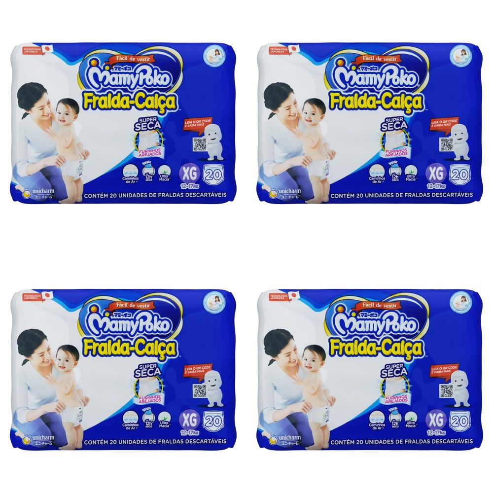 Kit 4 Fraldas Infantil Super Seca Calça MamyPoko XG Pacote 20 Unidades cada