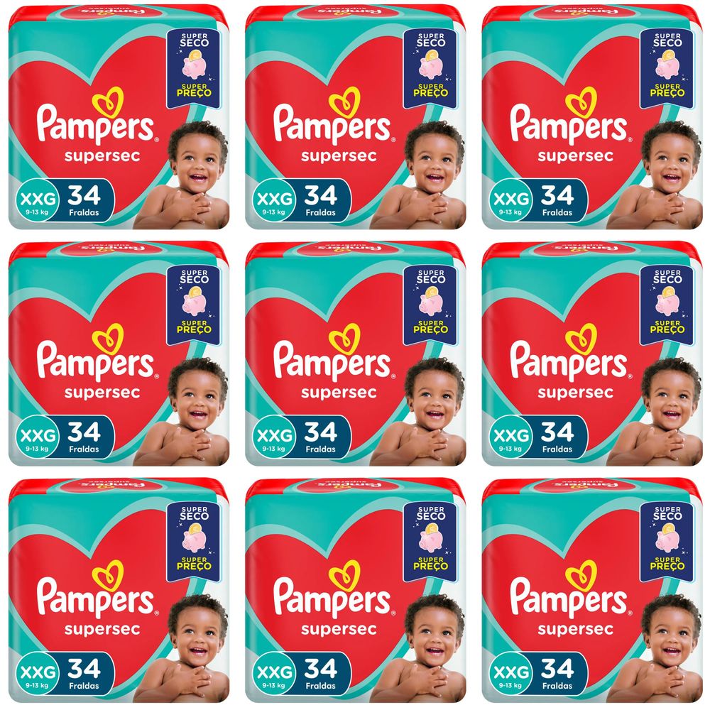 Kit 9 Fraldas Supersec Hiper ”Xxg” Pampers Simples c/34 Unidades cada