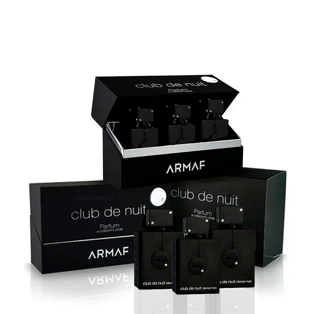 Club de Nuit Intense Man Parfum 30ml: Aromático Frutado, lançado em 2022. Notas de topo: Limão, abacaxi, bergamota, groselha preta, maçã; coração: Vidoeiro, jasmim, rosa; base: Âmbar cinzento, almíscar, patchouli, baunilha. Mais terroso e com melhor desempenho que o EDT.