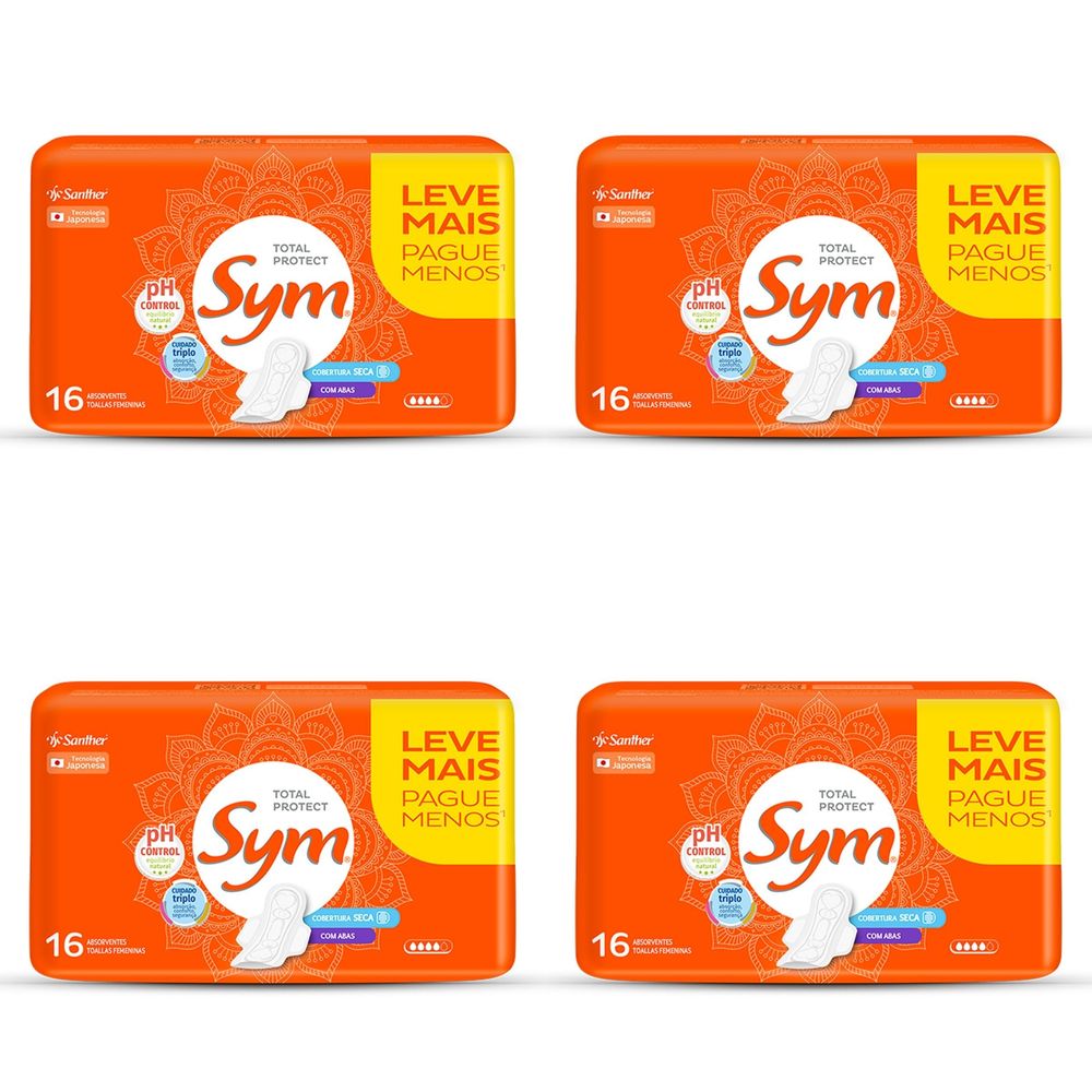 Kit c/4 Absorvente Sym Total Protect Cobertura Seca Com Abas 16 Unidades cada