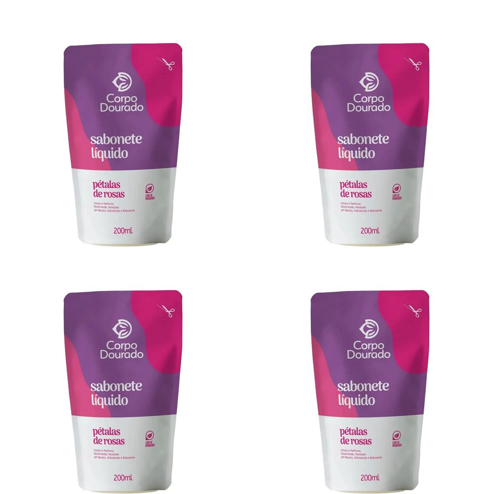 Kit c/4 Sabonetes Líquido Corpo Dourado Pouch Petalas De Rosa 200ml