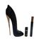Design ou Praticidade: Frasco icônico em formato de stiletto azul escuro para o perfume, luxuoso e portátil; máscara em tamanho mini de 2ml para aplicação precisa e viagens.