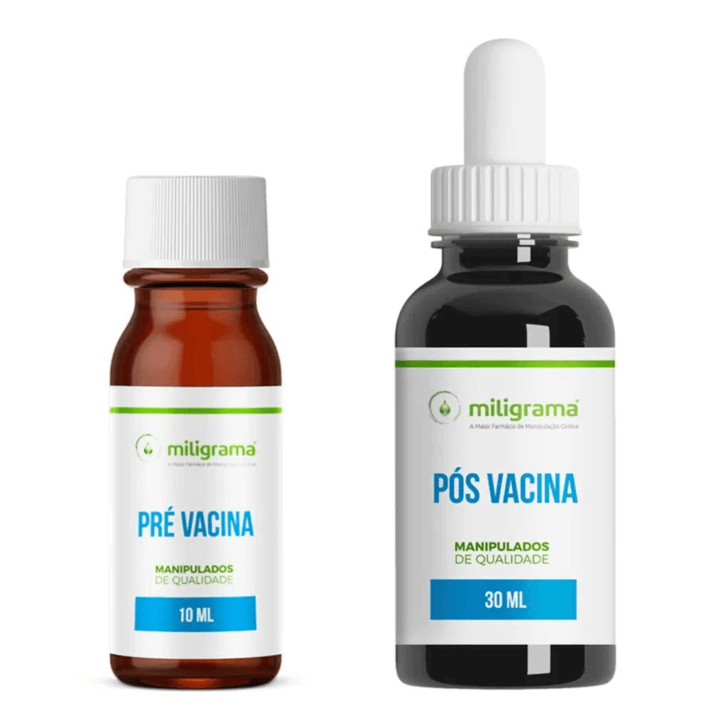Kit Homeopático para VacinaçãoAs reações pós-vacina são mais frequentemente benignas: podem ser inflamações cutâneas no ponto da injeção (com ou sem febre) ou sintomas similares à doença para que a vacina foi aplicada. O tratamento homeopático no dia e após a vacinação tem por objetivo diminuir os efeitos indesejáveis das reações causadas pela vacina.O que é?Kit homeopático para auxiliar na amenização das reações ocasionadas pela vacina no organismo.Como age?Thuya occidentalis ajuda a fortalecer o sistema imunológico e amenizar os efeitos nocivos da vacinação.Nux vomica auxilia na irritabilidade.Indicações- Diminuir as reações indesejáveis que a vacinação causa.ComposiçãoNo dia da vacinação: Thuya CH9Água destilada qsp 10mlApós a vacinação:Thuya CH5Nux vomica CH5Solução hidroalcoólica 5% qsp 15mlModo de UsarThuya CH9, em dose única no dia da vacinação.Após a vacinação:Thuya CH5Nux vomica CH5Solução hidroalcoólica 5% qsp 15mlTomar 5 gotas 2x ao dia, até sintomas melhorarem.ValidadeThuya CH9: 30 diasThuya CH5, Nux vomica CH5: 3 mesesAdvertências1. Recomendado o uso para crianças acima de 2 anos.2. Nunca compre medicamento sem orientação de um profissional habilitado.3. Imagens meramente ilustrativas.4. Pessoas com hipersensibilidade às substâncias da fórmula não devem ingerir/utilizar o produto. No caso do surgimento de alguma hipersensibilidade, sugere-se descontinuar o produto e consultar um médico.5. Não use o produto com prazo de validade vencido.6. Manter em temperatura ambiente (15 a 30ºC). Proteger da luz, do calor e da umidade.7. O medicamento não deve ser guardado em locais que contenham cheiros fortes e nem próximos a aparelhos que emitam radiações (televisão, geladeira, detectores de metal, telefones celulares, computador, rádio, etc.).8. O medicamento deve ser tomado longe das refeições, no mínimo meia hora antes ou depois. Se for ingeri-lo próximo à escovação dos dentes, o paciente deverá fazê-lo 10 minutos antes ou 30 depois.9. Menta, cânfora, Gelol, Vick, iodetos e cheiros fortes podem inibir a ação do medicamento homeopático.10. Todo medicamento homeopático deve ser mantido longe do alcance de crianças.11. Ao tomar medicamentos em gotas, não encoste a cânula na boca, pois isto poderá levar contaminação para o interior do frasco do medicamento.12. As gotas podem ser utilizadas diretamente na boca, sublingual ou diluídos em pequena quantidade de água (uma colher de chá).13. Formulações líquidas deverão ser agitadas no mínimo 10 vezes antes de serem administradas.14. Se persistirem os sintomas, o médico deverá ser consultado.15. Não se trata de propaganda e sim descrição do produto, consulte sempre um especialista.16. As indicações terapêuticas deste medicamento foram definidas conforme dados publicados na literatura homeopática. Este medicamento não foi submetido a estudos clínicos para comprovação de eficácia.17. Venda sob prescrição de profissional habilitado, podendo este ser o nosso farmacêutico de acordo com a Resolução 586/2013 do Conselho de Farmácia. Consulte-o!Referências1. SAREMBAUD, A. – 140 Prescrições em Homeopatia – São Paulo: Organização Andrei Editora, 2010