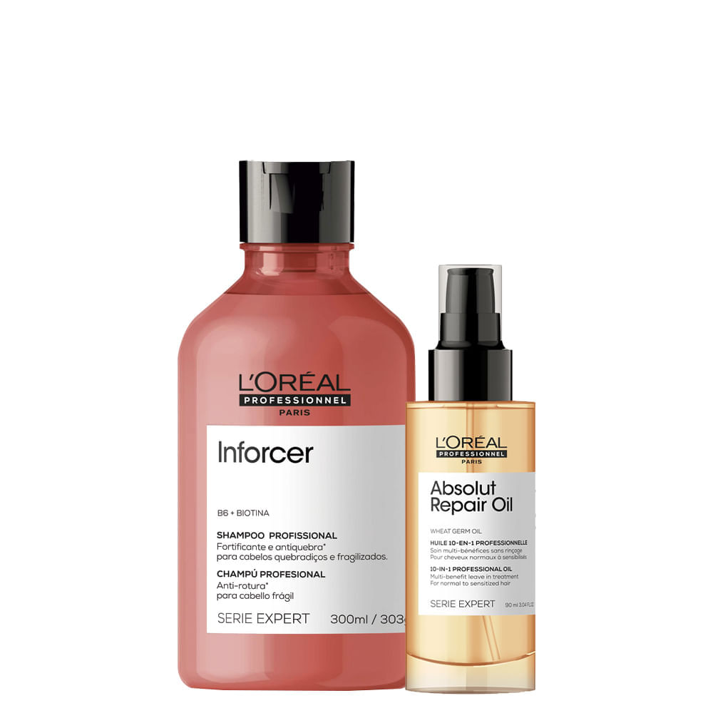 O Kit L'Oréal Professionnel Serie Expert Inforce nutre pronfundamente enquanto ajuda no crescimento do cabelo já existente. Suas fórmulas são perfeitas para quem está querendo deixar os fios compridos com força e saúde.
