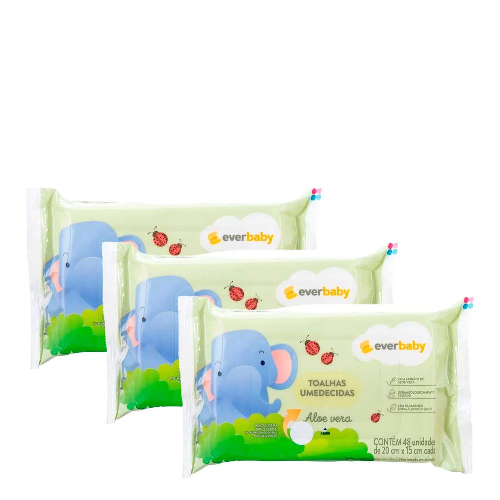 Kit Lenço Umedecido Ever Baby Aloe Vera 3 Pacotes com 48 Unidades