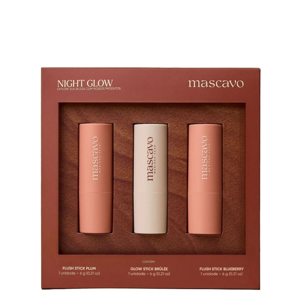 Kit Mascavo Celebration Edition Night Glow 3x6g – Acabamento Glow Natural, Textura Cremosa e Fácil EspalhabilidadeIluminador e blush em bastão indicados para quem busca realçar as maçãs do rosto e realçar pontos de luz com sofisticação. O Kit Mascavo Celebration Edition Night Glow composto pelo Blush Bastão Plum 6 gramas, Blush Bastão Blueberry 6 gramas e Iluminador em Bastão Brûlée 6 gramas, oferece alta pigmentação, acabamento luminoso e fórmula que derrete na pele, ideal para maquiagens naturais ou mais marcantes. Sua textura cremosa permite aplicação precisa e esfumado fácil, integrando-se perfeitamente à pele sem acumular.Desenvolvido para trazer brilho e cor com elegância, o Kit Mascavo Celebration Edition Night Glow é inspirado nas noites vibrantes e é perfeito para criar looks de festa, dia a dia ou ocasiões especiais. Os tons foram cuidadosamente escolhidos para complementar diferentes tons de pele, enquanto a embalagem de edição limitada transforma o kit em um presente desejado para amantes de maquiagem. As barras deslizam suavemente sobre a pele, permitindo cobertura leve a média e fácil construção.Cada produto do kit possui fórmula com pérolas ultrafinas que refletem a luz de maneira sutil, garantindo um glow natural sem aspecto artificial. O acabamento é altamente difundido, evitando pontos de luz excessivos e proporcionando luminosidade equilibrada. Sua fórmula é dermatologicamente testada, vegana e cruelty-free, ideal para todos os tipos de pele, inclusive sensíveis.Por ser multiuso, os bastões podem ser aplicados nas maçãs do rosto, pontes do nariz, arco de cupido, queixo ou pálpebras, permitindo versatilidade na criação de visuais. A fórmula adere bem à pele, com longa duração e resistência ao desbotamento ao longo do dia. Prático e eficaz, o Kit Mascavo Celebration Edition Night Glow substitui potes e líquidos, trazendo praticidade para a bolsa ou nécessaire.Benefícios do Kit Mascavo Celebration Edition Night GlowTextura cremosa que derrete na pele sem puxar ou acumular.Pigmentação intensa com cobertura construível para efeitos naturais ou mais marcantes.Acabamento glow natural com reflexos luminosos sutis.Produto multiuso: pode ser usado no rosto e olhos.Fácil de esfumar com dedos, pincel ou esponja.Fórmula vegana, cruelty-free e dermatologicamente testada.Edição limitada e ideal para presentear.Ação/Resultado dos AtivosPérolas Ultrafinas: Dispersam uniformemente a luz sobre a pele, criando efeito luminoso natural sem glitter aparente.Óleos Emolientes: Promovem deslizamento suave e aderência imediata, evitando tiras ou rachaduras na aplicação.Polímeros Filmogênicos: Formam uma película flexível que fixa o produto na pele, aumentando a durabilidade do acabamento.Vitamina E: Ação antioxidante que ajuda a proteger a barreira cutânea durante o uso prolongado do produto.Ceras Naturais: Proporcionam estrutura à fórmula, mantendo a integridade do bastão e liberando cor de forma uniforme.Sua combinação de tecnologias permite uma experiência sensorial completa: fácil aplicação, acabamento profissional e longa duração, com respeito à saúde da pele.Como Usar o Kit Mascavo Celebration Edition Night GlowGire suavemente a base do bastão para expor o produto.Aplique diretamente nas áreas desejadas: maçãs do rosto, têmporas, arco de cupido ou pálpebras.Esfume imediatamente com os dedos, pincel ou esponja para um acabamento suave e natural.Para maior intensidade, acrescente camadas finas, esperando a anterior selar levemente.Feche o produto após o uso para manter a textura estável e protegida.