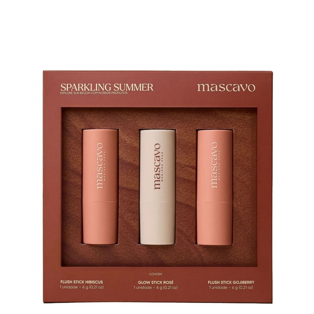 Kit Mascavo Celebration Edition Sparkling Summer 3x6g – Cor Saudável, Acabamento Glow e Textura CremosaKit de maquiagem indicado para quem busca praticidade, versatilidade e um visual radiante. O Kit Mascavo Celebration Edition Sparkling Summer composto pelo Blush em Bastão Hibiscus 6 gramas, Iluminador em Bastão Rosé 6 gramas e Blush em Bastão Gojiberry 6 gramas, oferece uma experiência sensorial única com fórmulas leves, pigmentação construível e alto poder de fusão que realçam a naturalidade da pele com acabamento glow de longa duração. Sua textura balm desliza suavemente, permitindo aplicação precisa e esfumado fácil, ideal para um look fresh e iluminado.Cada peça do kit foi desenvolvida para uso multifuncional: os blushes em bastão podem ser aplicados nas maçãs do rosto, pálpebras e até lábios, garantindo harmonia na maquiagem com tons vibrantes inspirados no verão. O Hibiscus traz um rosa vibrante com subtom frio, enquanto o Gojiberry oferece um coral intenso com brilho quente, complementado pelo Rosé, um iluminador com pérolas ultrafinas que refletem a luz suavemente, criando efeito de pele saudável e descansada.Com fórmula vegana, dermatologicamente testada e não comedogênica, o Kit Mascavo Celebration Edition é ideal para todos os tipos de pele, inclusive sensível. A embalagem compacta e resistente garante praticidade para levar na bolsa ou nécessaire, perfeito para retoques durante o dia, viagens ou eventos. Além disso, o formato em bastão elimina a necessidade de pincéis no momento da aplicação, oferecendo maior higiene e controle na dose do produto.A Celebration Edition Sparkling Summer une estilo, performance e inovação em uma edição limitada que combina beleza e funcionalidade. Ideal para presentear ou compor uma rotina de maquiagem rápida e eficaz, sem abrir mão da qualidade e do acabamento profissional. Sua fórmula enriquecida com ativos hidratantes evita o ressecamento da pele, mantendo a maciez e conforto durante todo o uso.Benefícios do Kit Mascavo Celebration EditionTrês tons coordenados para maquiagem completa: blushes e iluminador.Textura cremosa e balm que desliza facilmente sobre a pele.Acabamento glow natural com longa duração e efeito saudável.Pode ser usado com os dedos, esponja ou pincel para maior versatilidade.Pigmentação construível, permitindo camadas suaves ou mais intensas.Ideal para pele natural, sem cobrir poros ou linhas finas.Fórmula vegana, não comedogênica e dermatologicamente testada.Ação/Resultado dos AtivosPolímeros Filmógenos: Formam uma película flexível que fixa o produto na pele, garantindo acabamento duradouro sem craquelar.Pérolas Ultrafinas: Refletem a luz de forma difusa, criando iluminação natural e sutil sem aspecto acinzentado.Óleo de Prímula: Ativo umectante que melhora a hidratação da pele, evitando o ressecamento e mantendo a maciez.Ceras Vegetais: Proporcionam textura balm com fácil espalhabilidade e acabamento fundido à pele.Vitamina E: Antioxidante que protege a barreira cutânea contra danos ambientais durante o uso prolongado.Ácido Hialurônico: Atrai água para a superfície da pele, mantendo a hidratação e preenchendo microtexturas para um visual mais uniforme.A combinação desses ativos em uma fórmula balanceada garante conforto imediato, aderência perfeita ao contorno da pele e resultados visíveis de cor natural e luminosidade duradoura, mesmo em climas quentes e úmidos.Como Usar o Kit Mascavo Celebration Edition Sparkling SummerGire levemente a base do bastão para expor o produto sem exagerar na quantidade.Aplique diretamente nas maçãs do rosto, pálpebras ou arco do cupido, dependendo do efeito desejado.Esfume o produto imediatamente com os dedos, uma esponja ou pincel para um acabamento natural e fundido.Para maior intensidade, aplique em camadas finas, construindo a cor gradualmente.Finalize com o iluminador em pontos de luz: ponta do nariz, ápice das maçãs e arco do cupido para brilho estratégico.