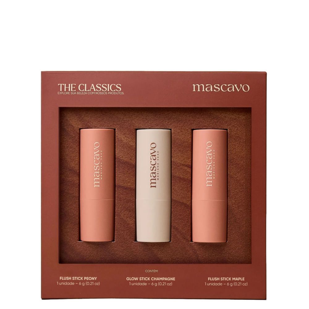 Kit Mascavo Celebration Edition The Classics 3x6g – Cor Saudável, Acabamento Glow e Textura CremosaKit indicado para quem busca praticidade e sofisticação na maquiagem. O Kit Mascavo Celebration Edition The Classics composto pelo Blush em Bastão Peony 6 gramas, Blush em Bastão Maple 6 gramas e Iluminador em Bastão Champagne 6 gramas, oferece alta pigmentação, fácil aplicação e acabamento glow natural, ideal para criar looks uniformes e radiantes em minutos.Este kit de edição limitada da Mascavo por Mariana Saad une qualidade, conveniência e beleza em um presente elegante e funcional. Cada bastão possui textura balm ou cremosa, que derrete na pele com toque leve e sensação confortável, garantindo uma aplicação uniforme sem acumular. Perfeito para usar na rotina diária ou em ocasiões especiais, sua fórmula multiuso permite aplicar nas maçãs do rosto, pálpebras e lábios, potencializando a naturalidade do visual com cobertura construível.A proposta do Kit Mascavo Celebration Edition The Classics é entregar praticidade sem abrir mão da alta performance. Os tons clássicos foram cuidadosamente escolhidos para complementar diversos tipos de pele, realçando as maçãs com cor saudável e pontos de luz estratégicos que iluminam o rosto com efeito tridimensional. Sua embalagem em stick permite aplicação direta, facilitando o espalhamento com os dedos ou pincel.Desenvolvido com cuidado dermatológico e eficácia comprovada, o kit é dermatologicamente testado, com fórmulas veganas e cruelty-free, livres de ingredientes de origem animal e não testados em animais. Ideal para quem busca maquiagem com responsabilidade e ética, sem comprometer a qualidade.Benefícios do Kit Mascavo Celebration Edition The ClassicsTrês tons versáteis para combinar em diversas ocasiões.Textura cremosa e balm de fácil espalhamento.Acabamento glow natural com brilho sutil e elegante.Pigmentação intensa e construível, permitindo controle da cobertura.Aplicação rápida e precisa graças à embalagem em bastão.Multiuso: pode ser usado em bochechas, olhos e lábios.Fórmula de longa duração que não desbota ao longo do dia.Ação/Resultado dos AtivosPérolas Ultrafinas: Dispersas no iluminador, refletem a luz de forma difusa, criando brilho delicado e harmonioso.Óleos Emolientes: Promovem sensação de maciez e ajudam na espalhabilidade da textura balm sobre a pele.Ceras Vegetais: Conferem estrutura ao bastão, garantindo consistência firme, mas derretível ao contato com a pele.Antioxidantes: Protegem a pele contra a ação dos radicais livres, ajudando a manter a saúde da barreira cutânea.Pigmentos Estáveis: Oferecem cores vivas e duradouras, sem oxidar ou perder a intensidade ao longo do tempo.Sua fórmula equilibrada combina desempenho estético e cuidado com a pele, promovendo maquiagem com benefícios sensoriais e durabilidade com toque confortável.Como Usar o Kit Mascavo Celebration Edition The ClassicsCom o rosto limpo e hidratado, gire levemente a base do bastão para expor o produto.Aplique diretamente nas maçãs do rosto, pálpebras ou lábios com movimentos pontuais ou contínuos.Espalhe com os dedos, pincel ou esponja para um acabamento natural e fundido.Camadas adicionais podem ser aplicadas para aumentar a intensidade da cor ou do brilho.Para maior fixação, finalize com pó translúcido ou spray fixador, se desejar.