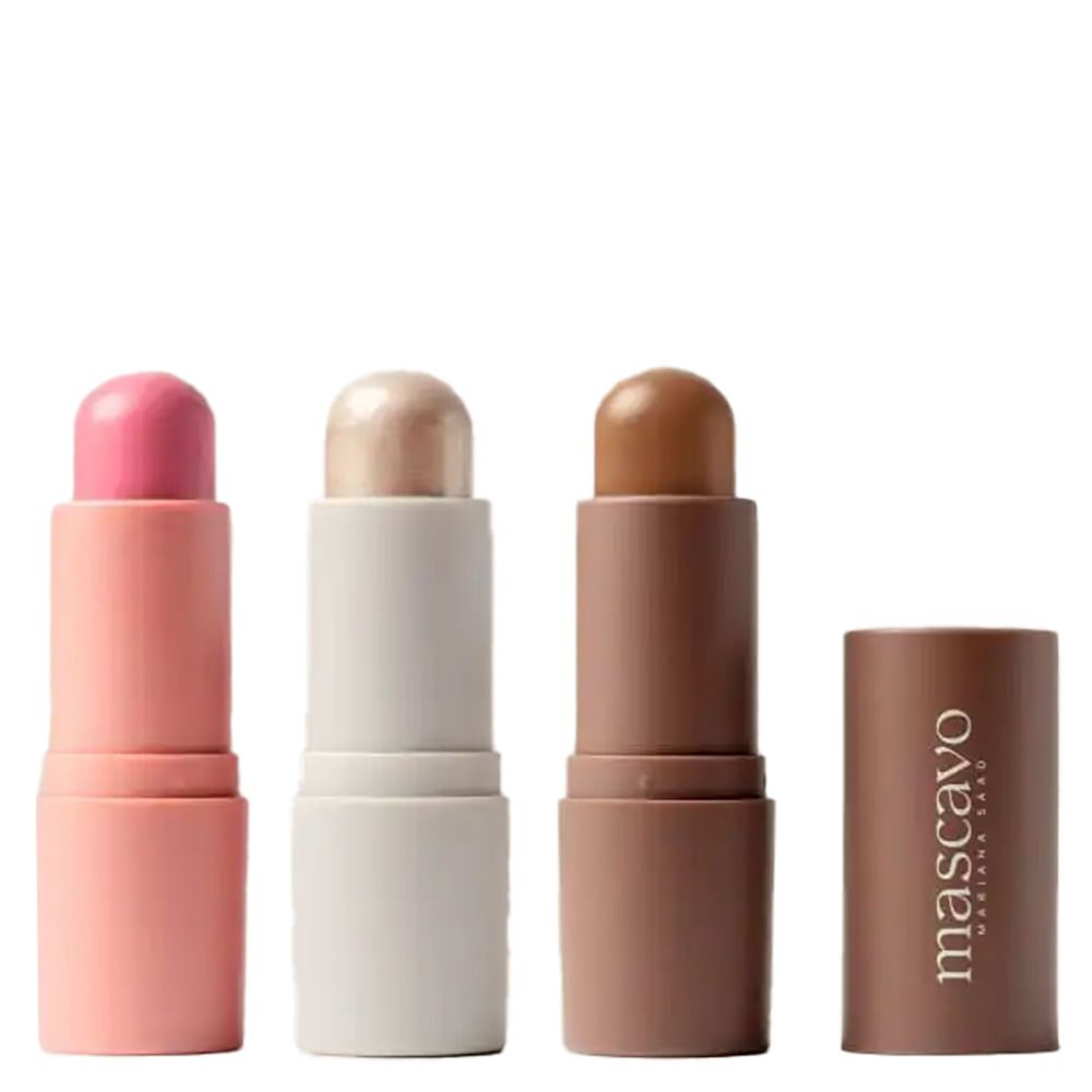 Kit de Maquiagem Mascavo Essentials Trio - Dawn – Contorno, Blush e Iluminador em BastãoKit indicado para todos os tipos de pele. O Kit Mascavo Essentials Solstice Trio reúne três produtos em bastão de alta performance 1 Contorno, 1 Blush e 1 Iluminador que juntos oferecem praticidade, versatilidade e acabamento impecável para qualquer produção, do dia a dia às ocasiões especiais. Sua fórmula cream-to-powder desliza suavemente sobre a pele, garantindo textura cremosa na aplicação e acabamento aveludado ao secar. Enriquecido com óleos nutritivos e esqualano vegetal, o trio não só realça a beleza natural, como também cuida da pele, mantendo-a hidratada e com aspecto saudável. Benefícios do Kit Essentials Trio Textura cremosa que se transforma em acabamento aveludado.Multiuso: produtos versáteis para diferentes áreas do rosto.Permite construção de camadas, de natural a intenso.Embalagem em bastão prática, ideal para levar na bolsa.Indicado tanto para iniciantes quanto para profissionais. Ação/Resultado dos AtivosÓleo de Macadâmia – Nutre e hidrata, deixando a pele macia e viçosa. Óleo de Camélia – Rico em antioxidantes, protege e revitaliza a pele. Esqualano Vegetal – Mantém o equilíbrio e a hidratação sem pesar. Textura Cream-to-Powder – Proporciona fixação confortável e acabamento natural. Produtos que compõem o KitContorno Shape Stick 6g – Cor Latte (subtom quente)Define os traços faciais, trazendo profundidade e elegância ao rosto.Blush Flush Stick 6g – Cor FreesiaAdiciona cor saudável e natural às maçãs do rosto, com efeito radiante e de longa duração.Iluminador Glow Stick 6g – Cor ChampagneGarante luminosidade sofisticada, destacando pontos estratégicos do rosto com brilho sutil e elegante. Como Usar o Kit Mascavo Essentials Trio - DawnContorno: aplique nas áreas que deseja dar profundidade, como laterais do nariz, abaixo das maçãs do rosto, têmporas e linha da mandíbula. Esfume com pincel, esponja ou dedos.Blush: deposite diretamente nas maçãs do rosto e esfume em direção às têmporas para um efeito lifting natural.Iluminador: aplique nos pontos altos do rosto, como ossinho da bochecha, dorso do nariz, arco do cupido e abaixo das sobrancelhas.Dica: construa camadas conforme a intensidade desejada. Precauções: suspenda o uso em caso de sensibilidade. Conserve o produto bem fechado, longe da luz e do calor. Mantenha fora do alcance de crianças.