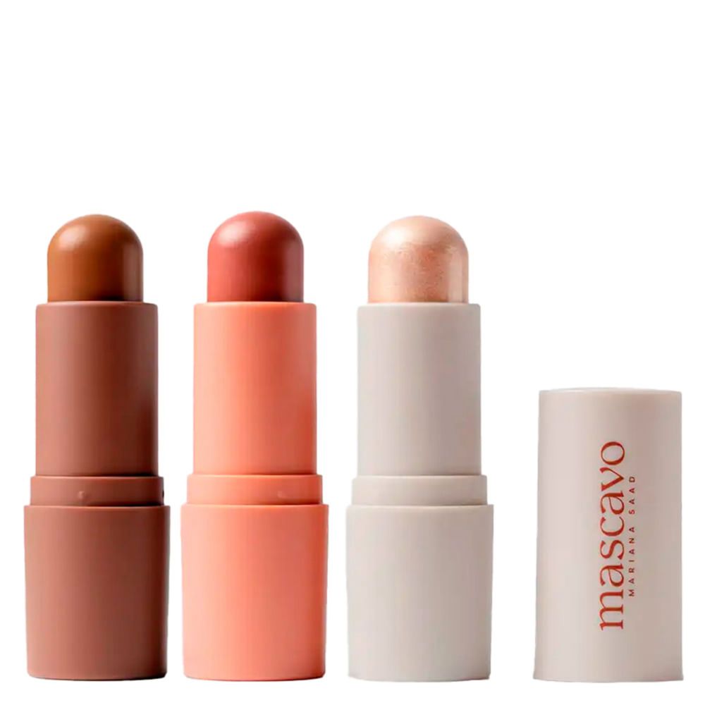 Kit de Maquiagem Mascavo Essentials Trio - Morning Dew – Contorno, Blush e Iluminador em BastãoKit indicado para todos os tipos de pele. O Kit Mascavo Essentials Solstice Trio reúne três produtos em bastão de alta performance 1 Contorno, 1 Blush e 1 Iluminador que juntos oferecem praticidade, versatilidade e acabamento impecável para qualquer produção, do dia a dia às ocasiões especiais. Sua fórmula cream-to-powder desliza suavemente sobre a pele, garantindo textura cremosa na aplicação e acabamento aveludado ao secar. Enriquecido com óleos nutritivos e esqualano vegetal, o trio não só realça a beleza natural, como também cuida da pele, mantendo-a hidratada e com aspecto saudável. Benefícios do Kit Essentials Trio Textura cremosa que se transforma em acabamento aveludado.Multiuso: produtos versáteis para diferentes áreas do rosto.Permite construção de camadas, de natural a intenso.Embalagem em bastão prática, ideal para levar na bolsa.Indicado tanto para iniciantes quanto para profissionais. Ação/Resultado dos AtivosÓleo de Macadâmia – Nutre e hidrata, deixando a pele macia e viçosa. Óleo de Camélia – Rico em antioxidantes, protege e revitaliza a pele. Esqualano Vegetal – Mantém o equilíbrio e a hidratação sem pesar. Textura Cream-to-Powder – Proporciona fixação confortável e acabamento natural. Produtos que compõem o KitContorno Shape Stick 6g – Cor Latte (subtom quente)Define os traços faciais, trazendo profundidade e elegância ao rosto.Blush Flush Stick 6g – Cor MapleAdiciona cor saudável e natural às maçãs do rosto, com efeito radiante e de longa duração.Iluminador Glow Stick 6g – Cor ChampagneGarante luminosidade sofisticada, destacando pontos estratégicos do rosto com brilho sutil e elegante. Como Usar o Kit Mascavo Essentials Trio - Morning DewContorno: aplique nas áreas que deseja dar profundidade, como laterais do nariz, abaixo das maçãs do rosto, têmporas e linha da mandíbula. Esfume com pincel, esponja ou dedos.Blush: deposite diretamente nas maçãs do rosto e esfume em direção às têmporas para um efeito lifting natural.Iluminador: aplique nos pontos altos do rosto, como ossinho da bochecha, dorso do nariz, arco do cupido e abaixo das sobrancelhas.Dica: construa camadas conforme a intensidade desejada. Precauções: suspenda o uso em caso de sensibilidade. Conserve o produto bem fechado, longe da luz e do calor. Mantenha fora do alcance de crianças.