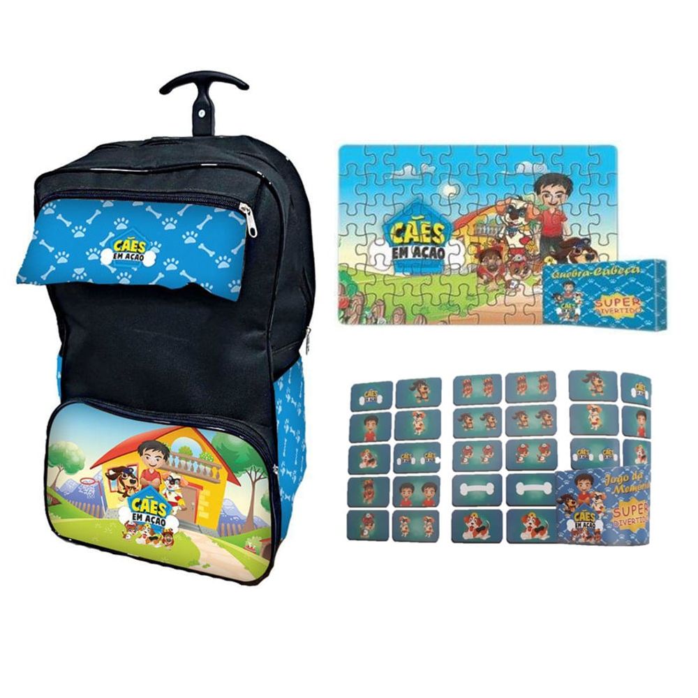 Kit Mochila Escolar + Jogo da Memória e Quebra Cabeça Cães em Ação